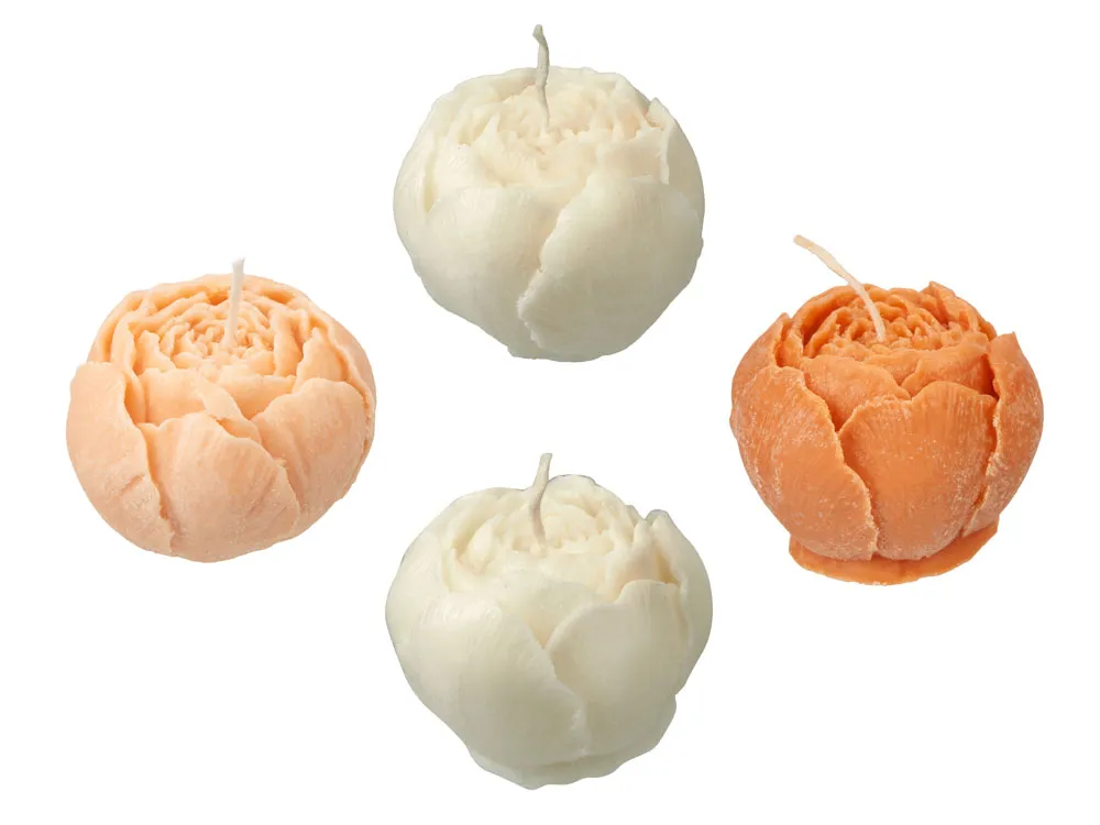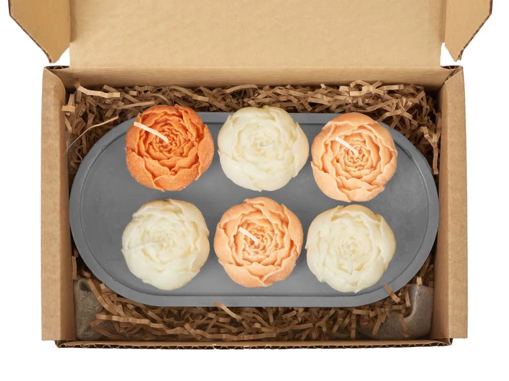 Набор из шести ароматических свечей в форме пионов поможет наполнить ваш дом нежностью и уютом. Природный дизайн в сочетании с графитово-серой подставкой из гипсобетона подойдет к любому интерьеру. В наборе три белых свечи со сладким ароматом французской ванили, две персиковых с согревающими и укутывающими нотками перца, нероли и амбры и одна темно-персиковая, обладающая свежим и успокаивающим запахом лаванды. Это позволяет выбрать аромат под настроение. Свечи на 80% изготовлены из натуральных соевого и кокосового воска, не токсичны при горении и не вредны для дыхания. После того как свечи прогорят, подставку можно использовать для пало санто или других благовоний, а также для хранения различных мелочей или ювелирных украшений. - Элегантный дизайн - Многофункциональная подставка из гипсобетона - Экосостав - Ручная работа