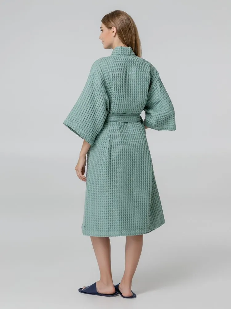 Вафельная структура ткани и минимум деталей делают халат легким и комфортным. Укороченные рукава, накладные карманы и длина обеспечивают максимальное удобство при движении, а рельефная клетка ткани создает массажный эффект.