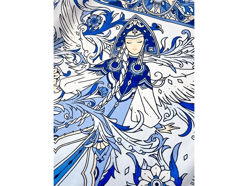 Дизайнерский платок «Царевна Лебедь» от Нины Ручкиной стал воплощением сказочного персонажа, прославленного великим и талантливым романтиком и поэтом — А. С. Пушкиным. Именно он впервые подарил нам образцы художественной русской эстетики, исходящей из самой глубины русской души. В центре авторского принта — удивительной красоты женщина с белоснежными крыльями, наделенная магическими способностями и житейской мудростью. Оригинальное сочетание тонов, цветочных орнаментов и русского колорита делают аксессуар нежным и самобытным. Платок с прекрасной Царевной Лебедь подойдет изящным и романтичным натурам, предпочитающим классику и традиционный русский стиль. Он станет деликатным дополнением как повседневного, так и вечернего образа утонченной леди. Над дизайном работали художники: Нина Ручкина, Мила Лосенко.