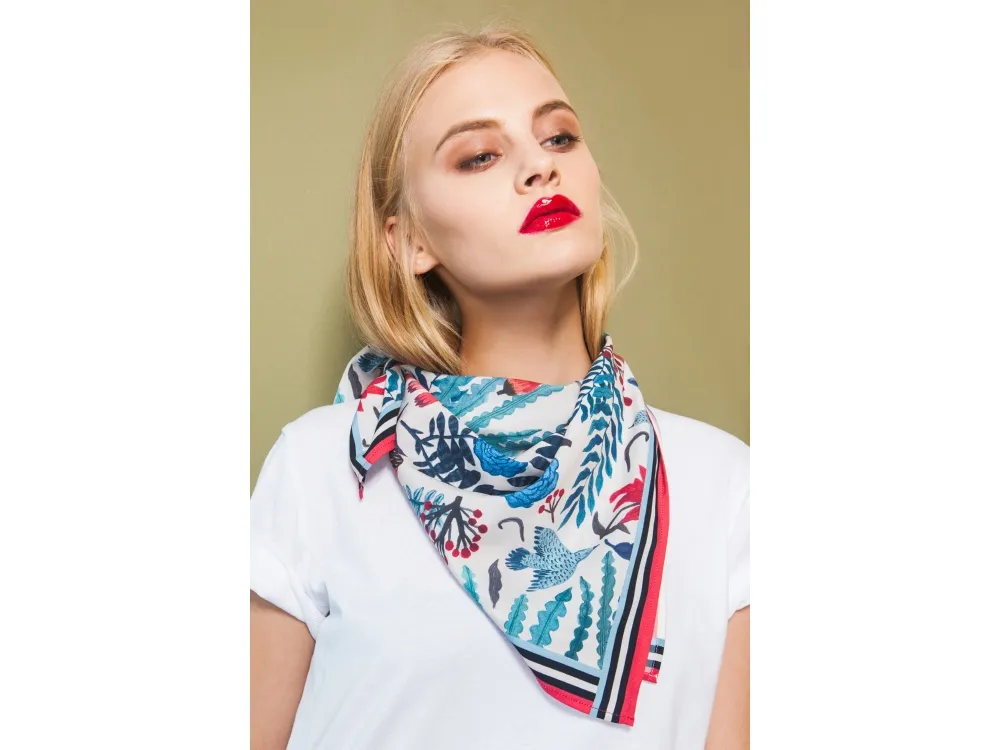 Платок из искусственного шелка саржевого плетения (твил) размером 70*70 см., с авторским принтом «Голубые розы». Авторский принт написан художницей вручную специально для российского бренда Varvara. Художница размышляла на тему русской природы, культуры и искусства: в основе принта лежат листья папоротника, соцветия клюквы, бутоны розы и загадочные птицы. Композиция рисунка напоминает иллюстрацию к русским сказкам. Платок упакован в подарочный тубус. Бережный уход. Ручная стирка при температуре не выше 30 градусов.