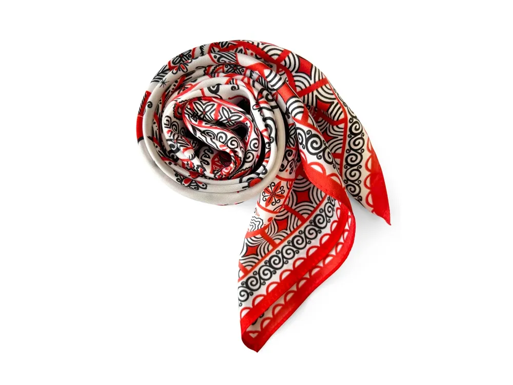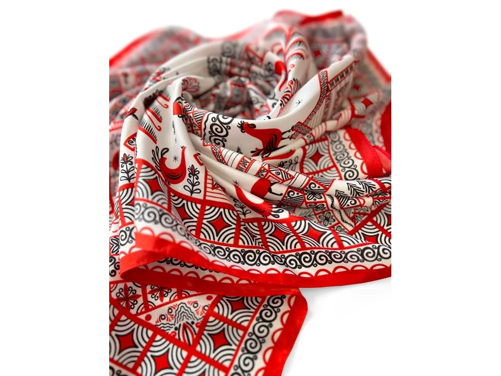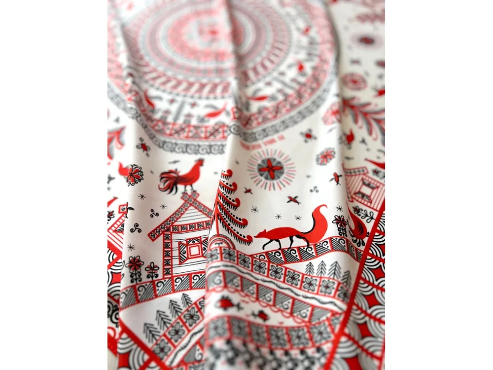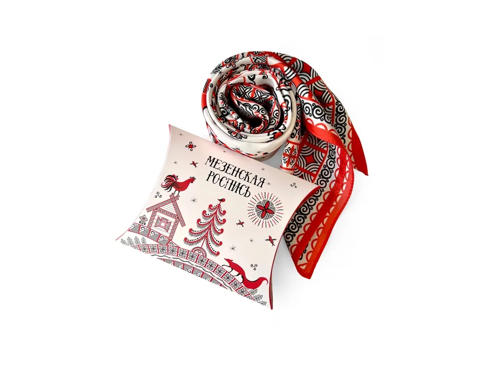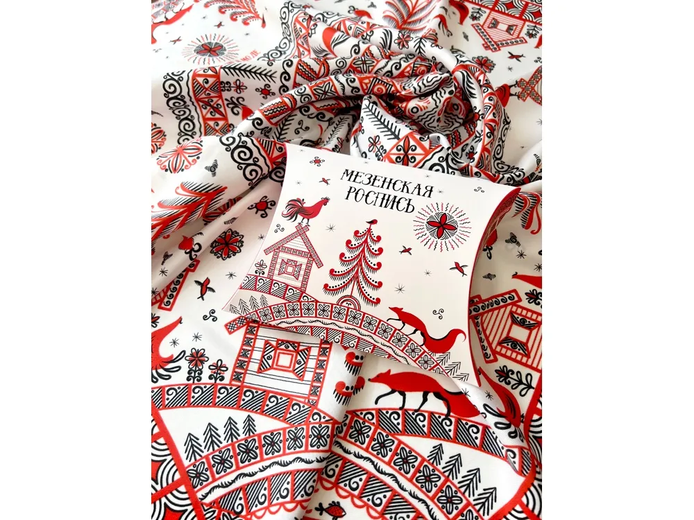 Самобытный орнамент знаменитой мезенской росписи, отличающейся зашифрованным символизмом, лег в основу элегантного платка “Мезенская роспись. Петух и лиса». Каждый элемент принта имеет особое значение, и располагается в строго определенном месте, создавая целый рассказ. Ранее такими рисунками украшали избы, посуду и кухонную утварь, передавая послание поколениям. Два народных персонажа, воспетых в старых добрых сказках, хранят в себе мудрость, стремление к свободе и почитание традиций предков. Их часто задействовали в мезенском народном промысле. Лиса — это символ огня и независимости, а петух — солнца и защиты. И ведь это те качества, которыми от природы наделена каждая представительница прекрасного пола. Шелковый аксессуар с красно-черной древней росписью и откликами русской истории гармонично дополнит собой элегантный наряд, станет роскошным оберегом для Вас! Он эффектно завершит образ, расставит недостающие акценты и подчеркнет Вашу уникальную красоту! Автор платка: Ирина Сказка