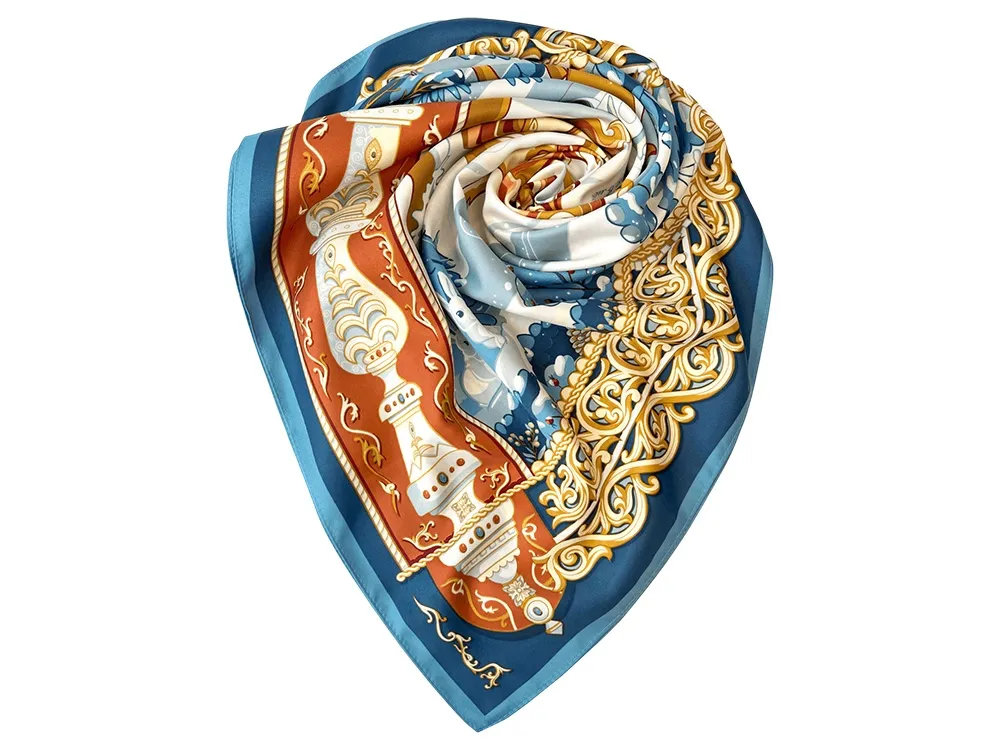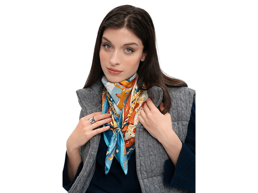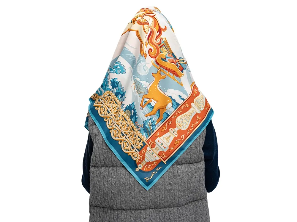 Русская зима, веками воспетая в искусстве, – чудесное время года, отражение национального характера и один из самых известных символов России. «Зимушка-зима», как ласково называли её на Руси, – пора рождественских праздников, домашнего уюта и тёплых встреч, великолепия преображенной природы. Это и долгий сезон крепкого мороза, формирующий знаменитые русские качества: стойкость духа, выдержку и смелость. Платок «Русская зима» воплощает фольклорный образ красавицы-зимы. Художественное пространство выстроено подобно книжной иллюстрации, где центральный сюжет раскрывается в обрамлении узоров по мотивам деревянного зодчества. Тройка лошадей, сани с красной девицей, стилизованный облик Деда Мороза или Морозко, ели, припорошенные снегом, в окружении добрых лесных зверей, – наполнены глубоким символизмом и создают атмосферу волшебства. Православные церкви среди пышных сугробов, озаренные яркими солнечными лучами, знаменуют торжество веры, возрождения и любви. Платок «Русская зима» создан совместно с Ассоциацией МАКО. Автор идеи — Анна Ревякина. Мы желаем прекрасной обладательнице платка «Русская зима», вдохновлённого традициями великой России, безграничного счастья и исполнения всех желаний! Над дизайном работали: Нина Ручкина, Анастасия Погодина, Анна Ревякина.