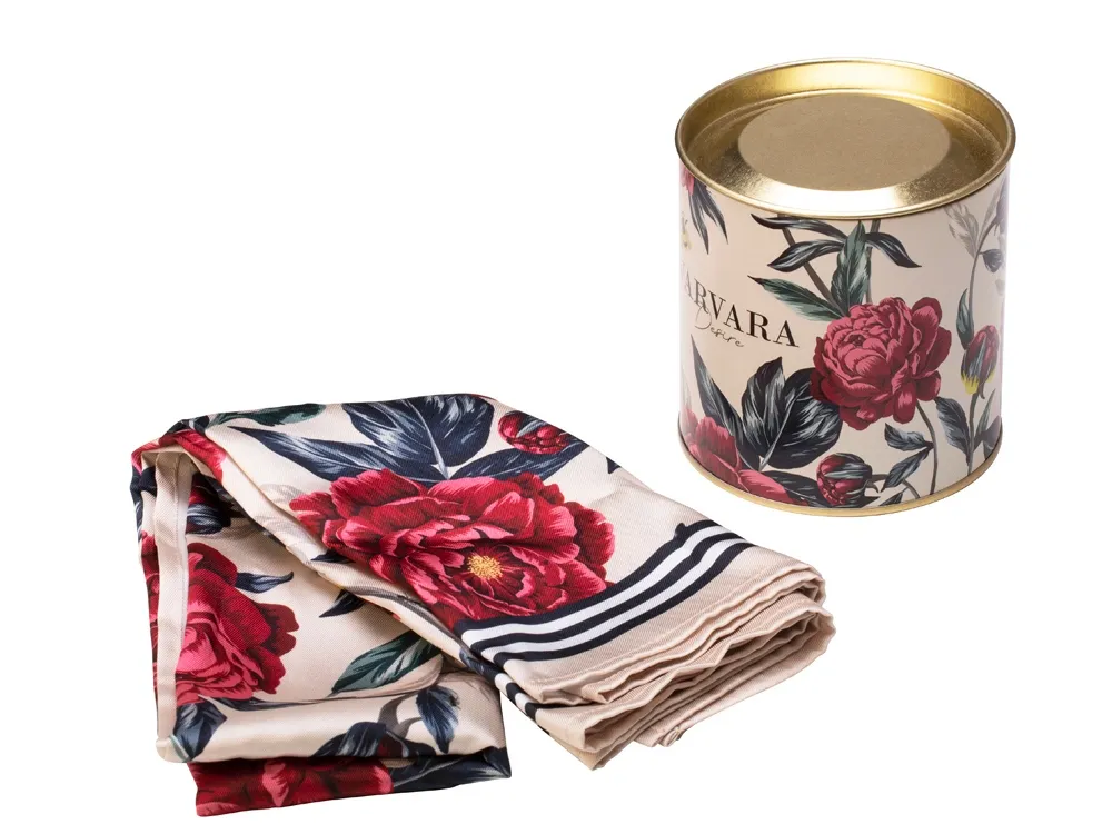 Платок из струящегося искусственного шелка, размером 70х70 см. Упакован в подарочный тубус.