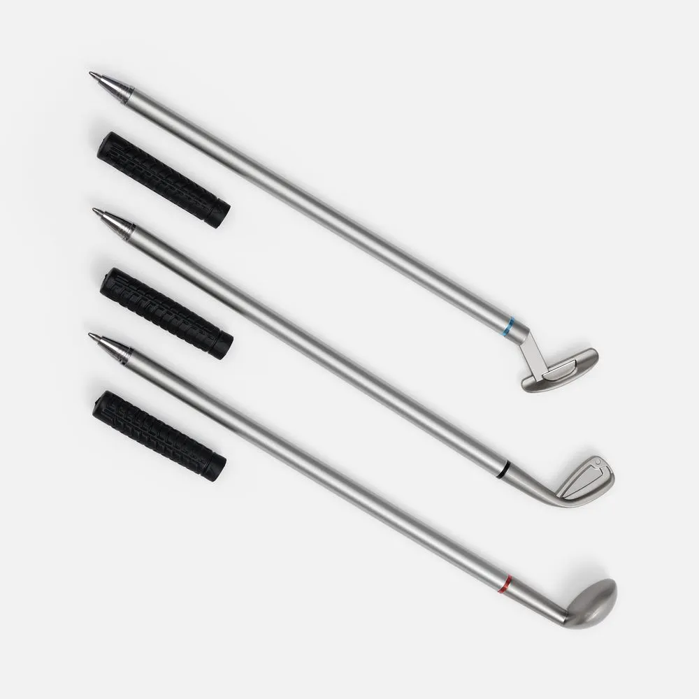 Без резиновых колпачков мини-клюшки превращаются в элегантные пишущие ручки, каждая со своим цветом чернил: черным, красным и синим.