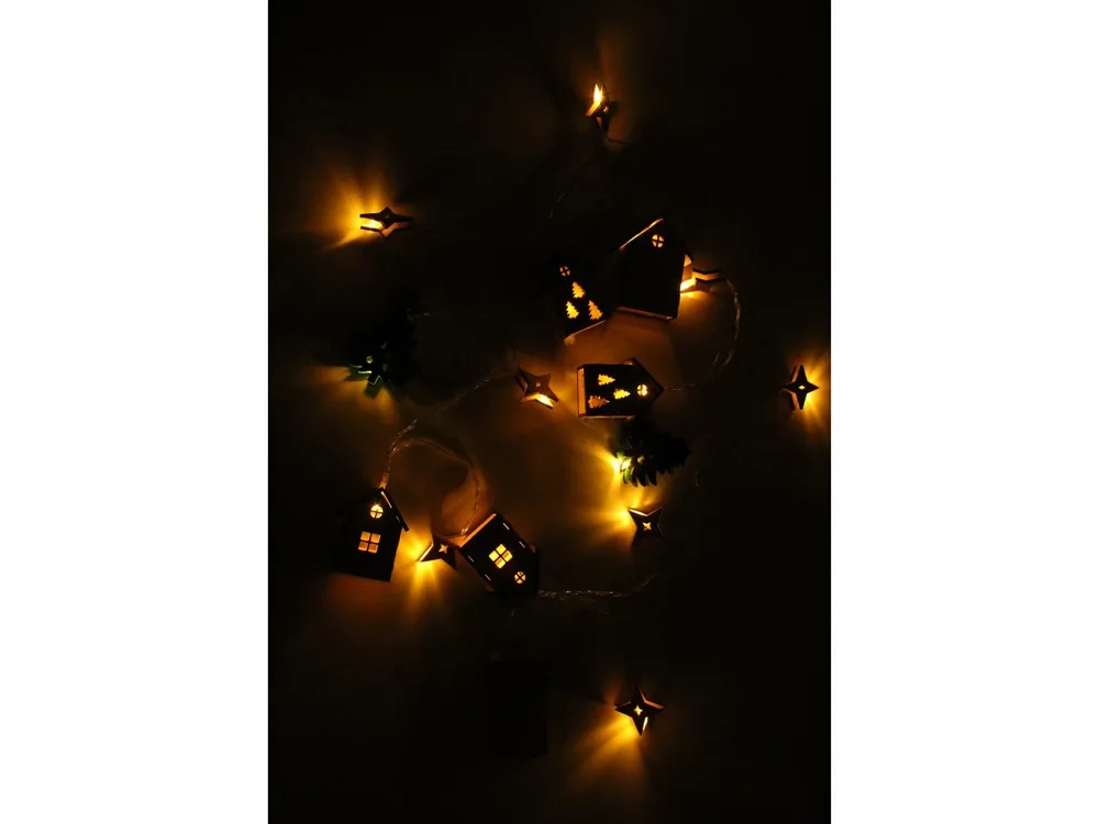 Светодиодная новогодняя елочная гирлянда постоянного свечения с цветными фигурками из натуральной березовой фанеры. Работает от 2-х батареек АА (в комплекте). Упакована в деревянную подарочную коробку со стружкой.