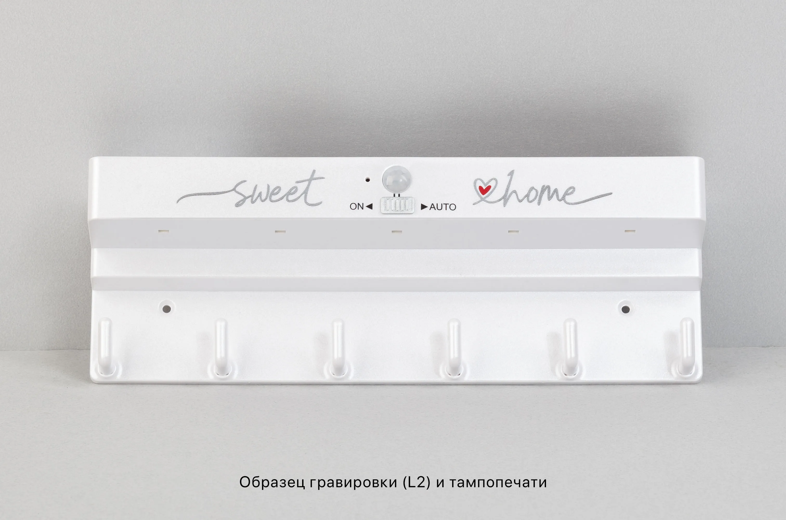 Шесть надежных крючков позволят аккуратно развесить ключи, сверху расположена удобная полочка. Универсальный белый цвет ключницы для любого интерьера, красивый перламутровый металлик. Рекомендуем обратить внимание на гравировку твердотельным лазером (L2), см. доп. фото.