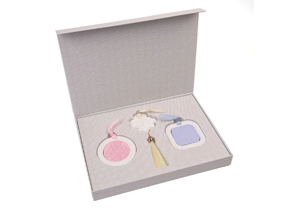 Набор из трех гипсовых аромасаше премиального качества с цветочным ароматом. Каждое саше уникально, но дополняют друг друга и прекрасно сочетается между собой, поддерживая ботаническими и геометрическими мотивами цветочный аромат. Саше украшены цветными лентами, за которые можно закрепить их на штанге или вешалке в гардеробной, а также, дополнены изящными деталями, такими как кисточка. Саше можно разместить в емкостях для хранения, шкафах, полках, вешалках, автомобиле и наслаждаться ароматом и свежестью. Аромат сохраняется в течение нескольких месяцев. Набор упакован в презентабельную подарочную коробку с логотипом, это оригинальный, готовый подарок для ценителей уюта, комфорта, красоты и идеальный способ побаловать себя. Преимущества гипсовых саше: • не оставляет пятен на одежде и поверхностях, в отличии от других материалов • не липкие • безопасны, для детей и животных, в случае если они захотят попробовать их на вкус (кроме декоративных элементов, их лучше снять перед использованием, если у детей и животных есть доступ) • можно использовать многократно, нанося ваши любимые ароматы, когда саше перестанет отдавать аромат