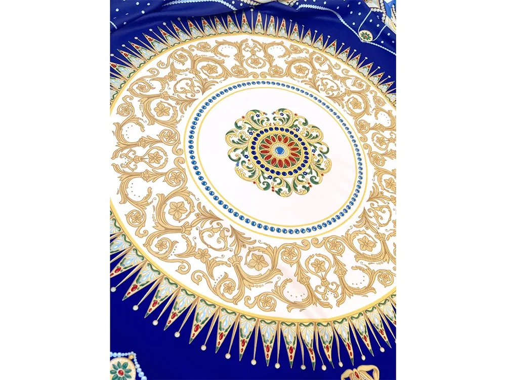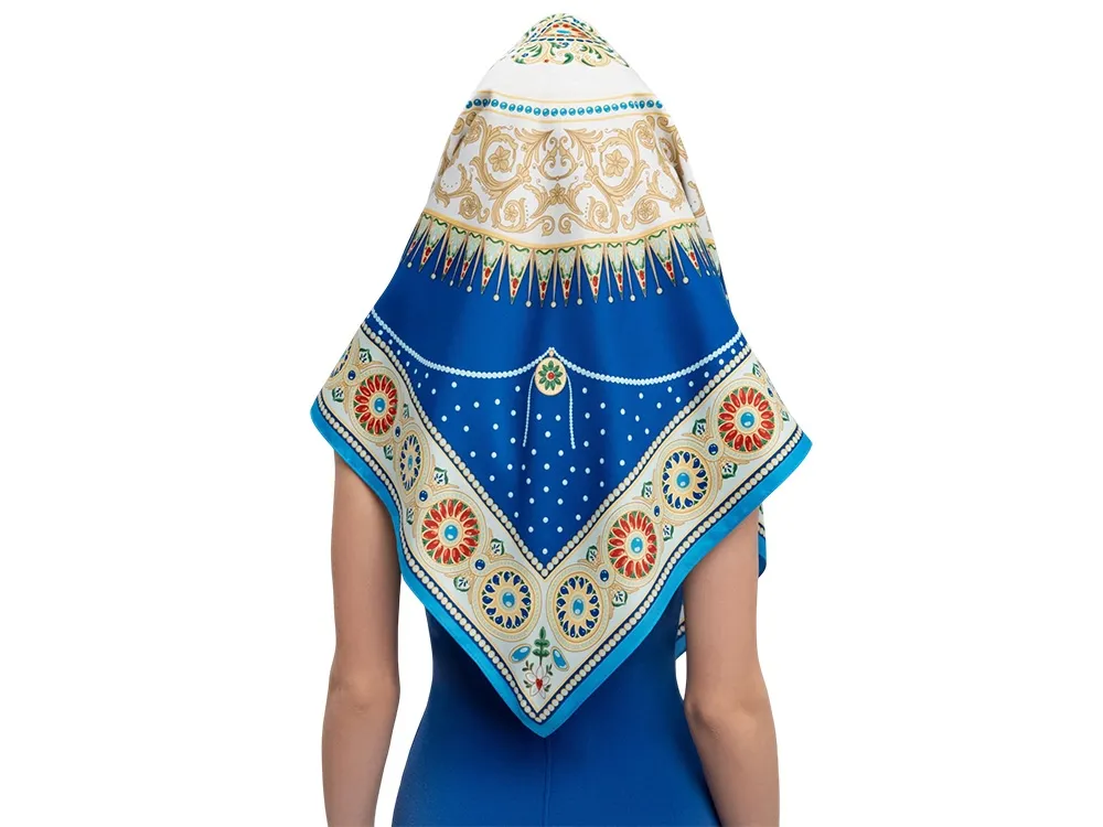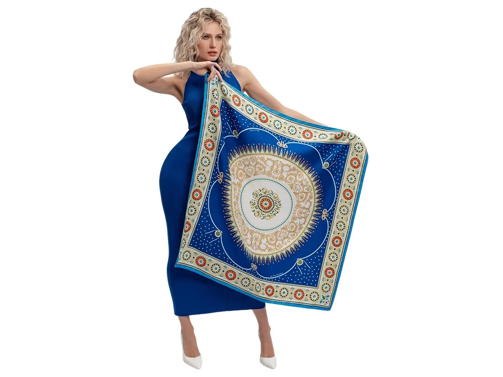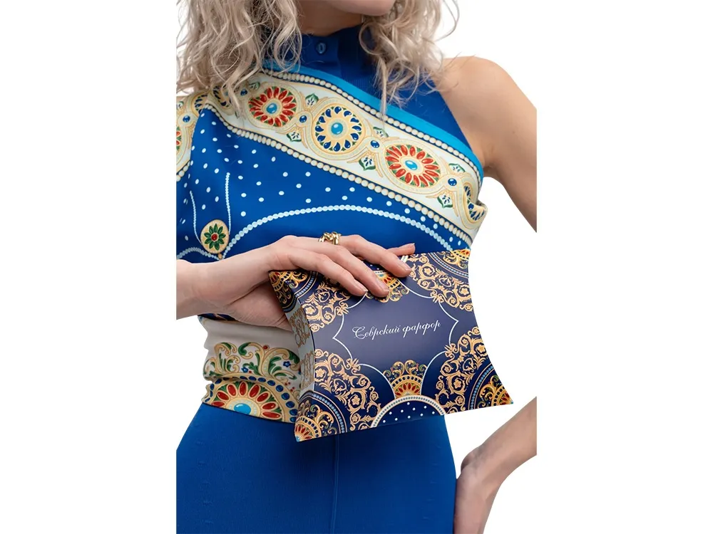 Платок «Севрский фарфор» создан брендом «Русские в моде» совместно с Музеем-заповедником «Павловск» и вдохновлен бесценным шедевром из исторической коллекции Павловского дворца – Севрским фарфоровым сервизом. В центре полотна размещен изящный медальон, повторяющий оригинальный рисунок севрского фарфора, выполненного в ювелирной технике накладных эмалей и словно украшенного россыпью драгоценных камней. Цветовой строй воспроизводит парадную эстетику дворцового фарфора, где глубокий королевский синий в сочетании с золочёным орнаментом образуют гармоничное звучание. Выразительный платок «Севрский фарфор» станет изысканным акцентом вашего образа или памятным подарком, воплощающим великолепие павловских коллекций и пробуждающим ощущение подлинной роскоши. Над дизайном работали: Нина Ручкина, Серафима Атаянц.