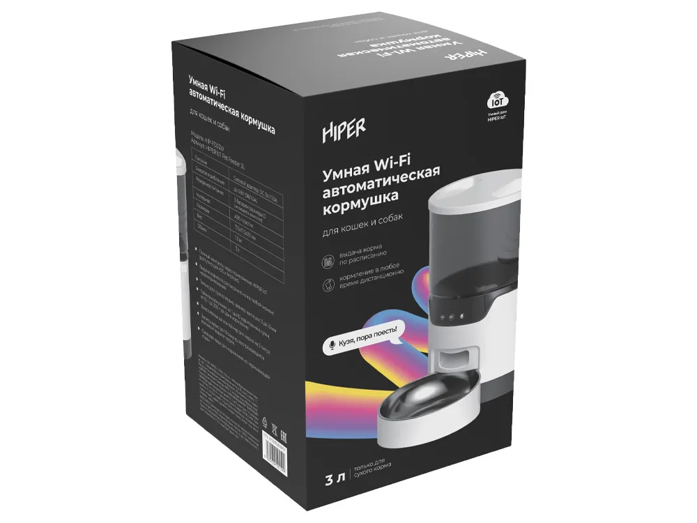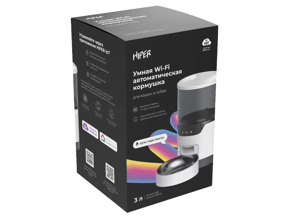 Умная автокормушка HIPER идеальный девайс, который оценят и питомцы, и хозяева. Устройство с автоподачей корма имеет контейнер на 3 литра сухого корма, этого объема хватит для кошки или маленькой собаки на 7-10 дней. Внутри контейнера имеется специальный фильтр, который защищает сухой корм от влаги. Также конструкция предусматривает встроенный вращающийся механизм, который обеспечивает равномерную подачу корма через широкое отверстие. Вы можете отрегулировать размер порции от 10 до 200 грамм. Расписание кормления можно настроить в бесплатном приложении HIPER IoT для всех смартфонов на Android и iOS, там же вы можете покормить питомца дистанционно в любой момент, где бы вы ни были. Чтобы питомец знал о кормлении, хозяин может записать своим голосом команду или звук, который будет сигнализировать четвероногому другу о том, что в миске появился корм. Чтобы питомец не остался без еды при внезапном отключении электроэнергии, кормушка имеет альтернативный источник питания через три батарейки типа D. Во время сбоев в сети кормушка автоматически перейдет на автономную энергию и не оставит питомца без еды.
