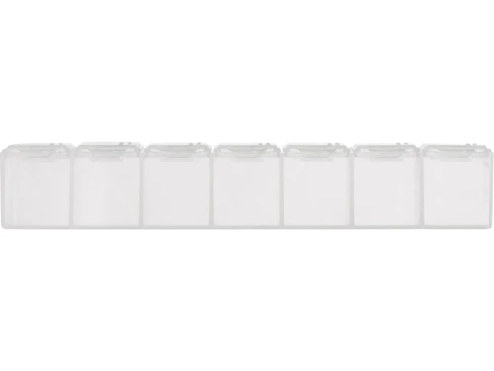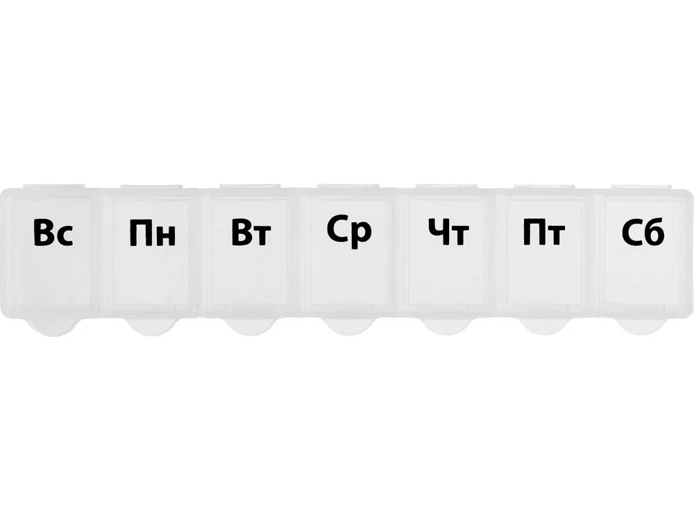 Таблетница с днями недели. Надписи продублированы шрифтом Брайля на английском языке. Каждый отсек оснащен крышкой с защелкой – содержимое не вывалится при тряске в машине или в сумке. Вы можете разместить на таблетнице свой логотип или другое изображение. Преимущества: · надежность хранения · отсеки подписаны по дням недели · удобно брать с собой в поездки