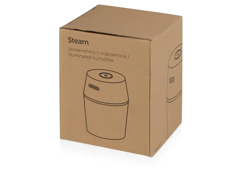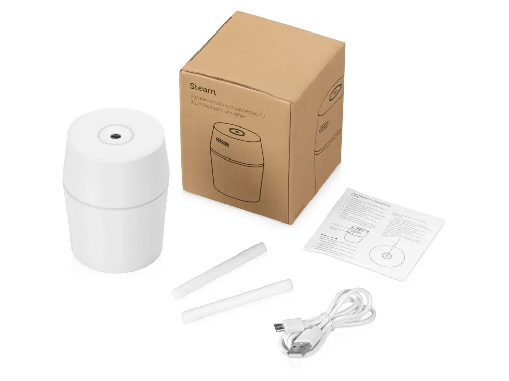USB Увлажнитель воздуха с голубой подсветкой «Steam»: • Мобильный и легкий, всего 85 гр • Мощность 1,5 Вт. • Емкость 200 мл. • Режим ночной подсветки. • Питание от USB-кабеля (идёт в комплекте). • Для использования в офисе, в машине или дома. • Инструкция в комплекте. • Упакован в крафтовую коробку. • Компактный и простой в использовании. • Область применения: 10 м². Не разрешается добавлять ароматические масла в увлажнитель.
