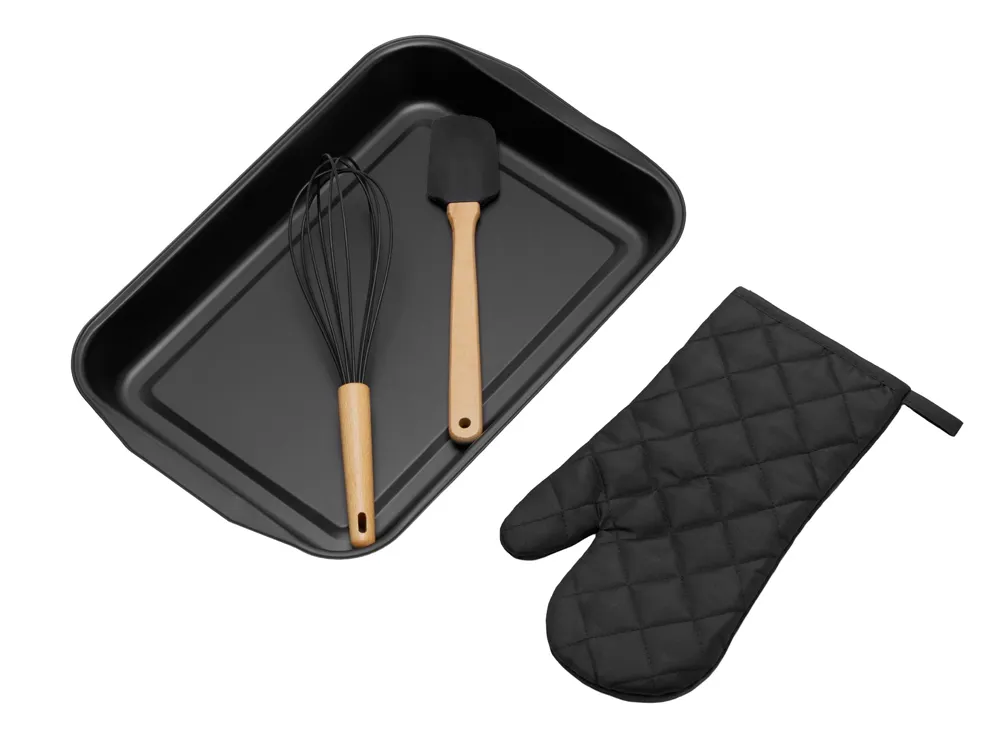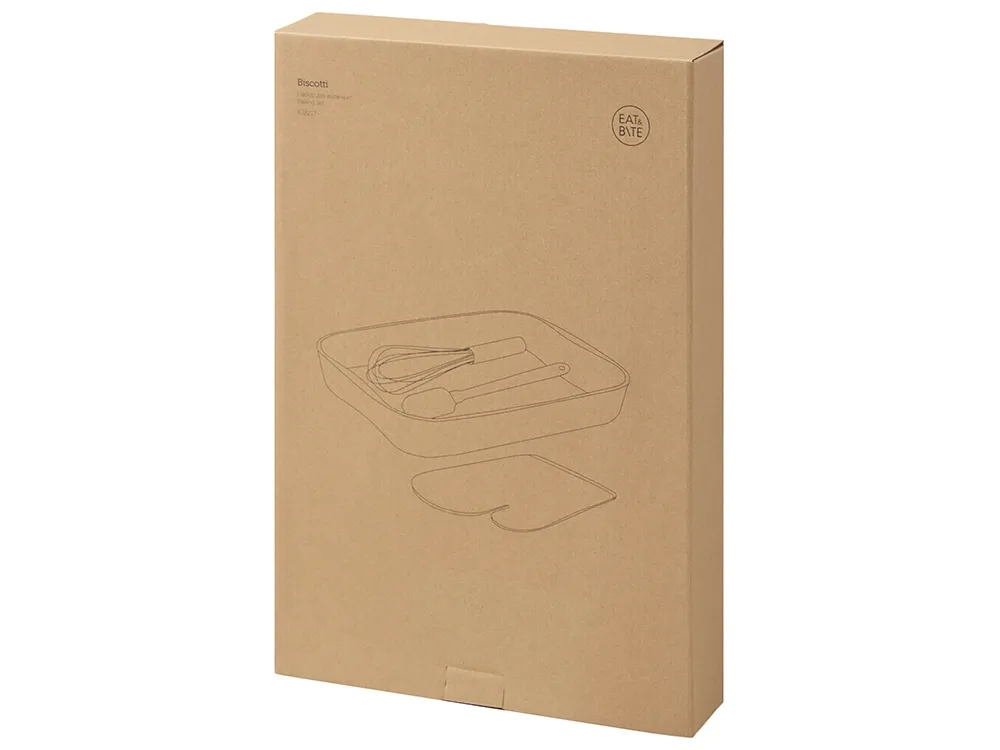 Кондитерский кухонный набор "Biscotti" незаменим на кухне любого кулинара. Большая форма для запекания отлично подойдёт для любых запеканок и пирогов, - их точно хватит на большую семью! Венчик и лопатка изготовлены из букового дерева - очень прочной и долговечной древесины, и пищевого силикона, который не впитывает жир, не царапает поверхности, а также легко моется! Приборы удобно ложатся в ладонь, обеспечивая комфорт при приготовлении. Варежка с одной стороны имеет гладкую поверхность, которая позволяет брендировать её термотрансфером. - полезный мерч; - высокое качество материалов; - большой размер формы для запекания: 41x27,5x4,2 см.