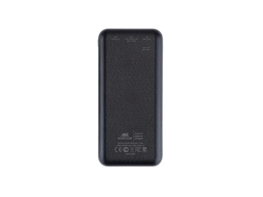 RIVACASE Литий-полимерный внешний аккумулятор с поддержкой QC 3.0 и PD и цифровым дисплеем • Литий-полимерный внешний аккумулятор емкостью 20000 мАч с поддержкoй QC 3.0 и PD20W. • Быстрая зарядка Iphone • Поддержка режима быстрой зарядки Quick Charge (QC 3.0) и Power Delivery 20W (PD) • Поддержка режимов быстрой зарядки Huawei FCP & Samsung AFC • Защита от перегрузок, короткого замыкания, чрезмерного заряда и разряда. • Цифровой дисплей показывает уровень заряда в процентах Преимущества: Быстрая зарядка Iphone Поддержка режима Quick Charge (QC 3.0) и Power Delivery (PD 20W) . Поддержка режимов быстрой зарядки Huawei FCP & Samsung AFC Наличие дополнительного входа/выхода Type-C, поддерживающего режим Power Delivery Кабель USB- Type-C в комплекте Функция сквозного заряда: Можно одновременно заряжать внешний аккумулятор и подключенное к нему устройство. Емкости достаточно для 5 зарядок среднего смартфона. Время перезарядки внешнего аккумулятора : 6 часов (при использовании QC/PD зарядки) Спецификация: Литий-полимерная батарея:: 3.7В 20000 мАч 74В*ч • Bxoд: Micro USB 5B 2A / 9B 2A / 12B 1,5A (поддерживает QC 3.0) Type-C 5B 3A / 9B 2A / 12B 1,5A (поддерживает QC 3.0/PD 3.0) • Bыxoд: USB1 5B 3A / 9B 2A / 12B 1,5A (поддерживает QC 3.0) USB2 5B 3A / 9B 2A / 12B 1,5A (поддерживает QC 3.0) Type-C 5B 3A / 9B 2.2A / 12B 1,5A (поддерживает PD20W 3.0) Размер: 143 x 67 x 28 мм Вес: 410г.
