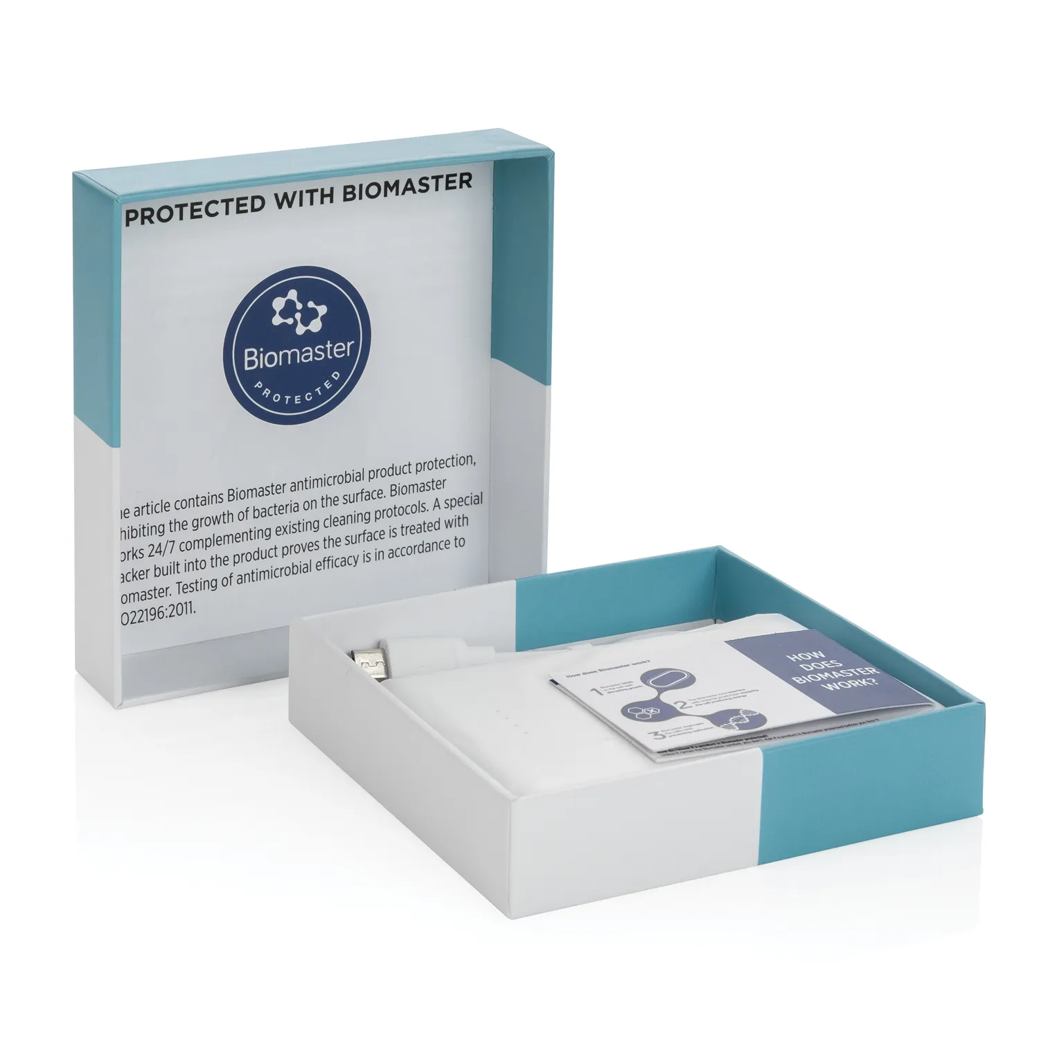 Внешний аккумулятор карманного размера на 5000 мАч сделан из ABS-пластика с добавлением антимикробного агента Biomaster, который обеспечивает дополнительную защиту от вредоносных бактерий. Антимикробный агент находится в материале изделия, а не только на поверхности, поэтому эффективность защитных свойств с течением времени не изменится. Товар протестирован в соответствии с международным стандартом антибактериальной эффективности ISO 22196, на 100% безопасен для пользователей. Кроме того, наличие антимикробного агента Biomaster не влияет на пригодность материала для вторичного использования. Изделие содержит уникальный индикатор Verimaster, позволяющий доказать наличие Biomaster в составе материала, в то время как большинство аналогичных изделий на рынке не могут подтвердить заявленные антимикробные свойства. Устройство оснащено литий-полимерным аккумулятором класса А емкостью 5000 мАч, позволяющим зарядить смартфон до 3 раз. Вход micro USB: 5 В / 2 А; 2 порта USB с выходом: 5 В / 2 А; 4 светодиодных индикатора на передней панели, показывающие уровень заряда устройства. Поставляется в подарочной коробке с подробной информацией об антимикробном агенте Biomaster.