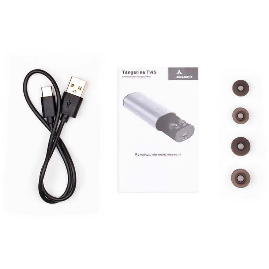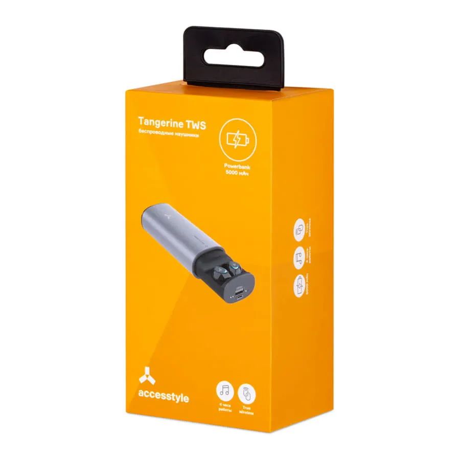 НЕ детские TWS-наушники два в одном — зарядный кейс можно использовать не только для наушников, но еще и как power bank ёмкостью 5000 мАч. Наушники будут проигрывать музыку, подкасты или радио на протяжении 4 часов подряд от одной зарядки. Их не придется долго держать у розетки, ведь время полной зарядки составляет всего 2 часа. Кейс оснащен разъёмом USB Type-C — на сегодня это самый популярный провод, через него заряжается большинство смартфонов и других гаджетов. Tangerine TWS совместимы не только с современными смартфонами, но и с ноутбуками, плеерами, телевизорами и любой другой техникой, которая поддерживает беспроводное соединение. Bluetooth 5.0 гарантирует отсутствие помех и прерываний в процессе прослушивания. Bluetooth 5.0 Время работы 4 часа Ёмкость батареи наушника 50 мАч Ёмкость батареи зарядного кейса 5000 мАч Тип батареи Литий-ион Радиус действия 10 м Чипсет Bluetrum Профиль Bluetooth HSP; HFP; A2DP; AVRCP Защита от влаги Нет Частотный диапазон 20 Гц — 20 кГц Сопротивление 16 Ω Размер динамика 3 мм Чувствительность динамика 93±3 дБ Чувствительность микрофона 45±3 дБ Время зарядки Около 2 часов Время в режиме ожидания Около 120 часов Входной порт Type-C Входное напряжение ток 5 В 1.0 А Выходное напряжение ток 5 В 2.1 А Размер наушников Ø26 х 18 х 25 мм Размер зарядного кейса 113 х 48 х 32 мм Вес наушников 8.5 г Вес зарядного кейса 172 гВремя поставки по заказной программе 5-7 рабочих дней