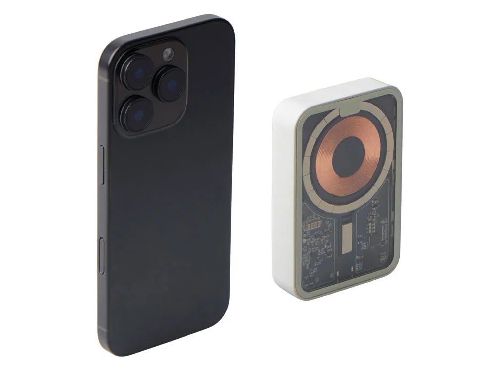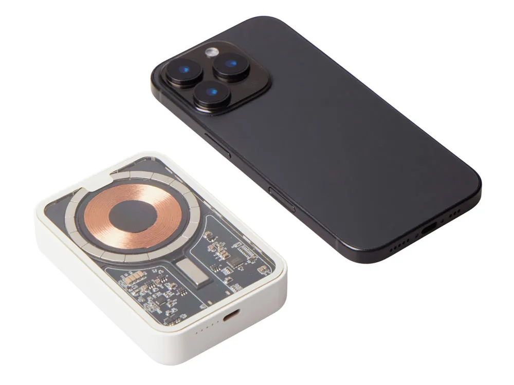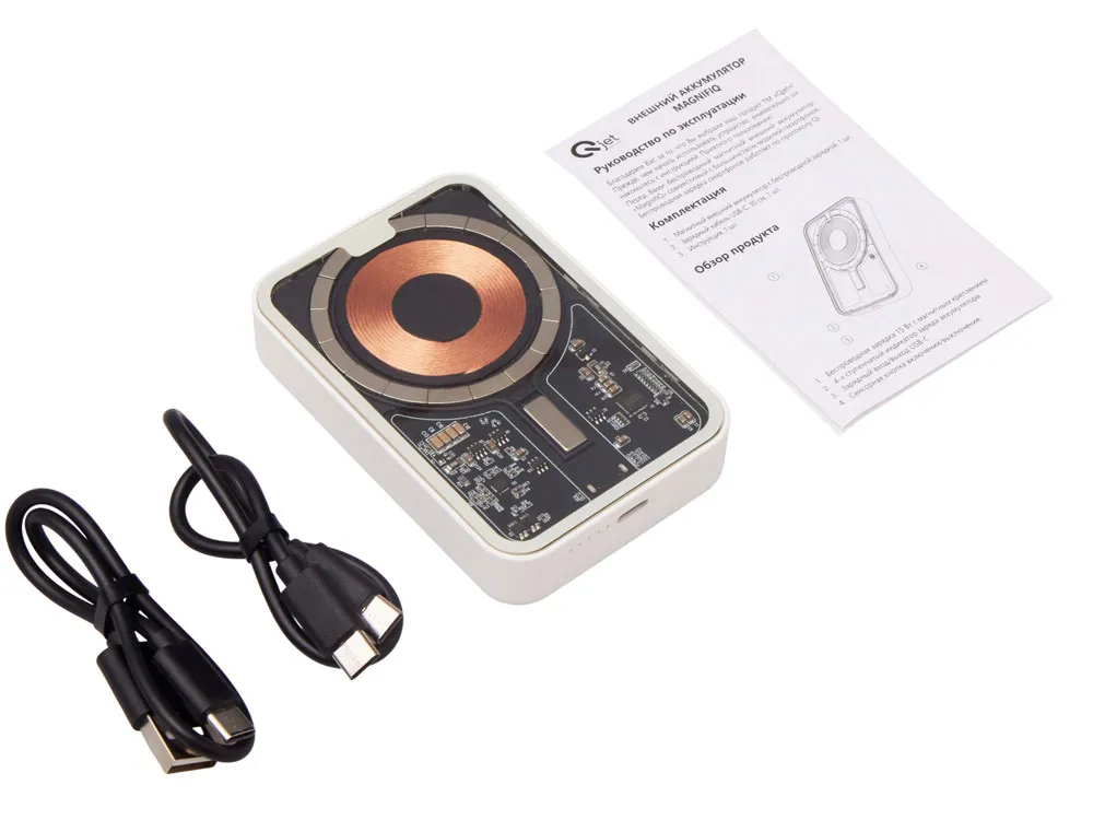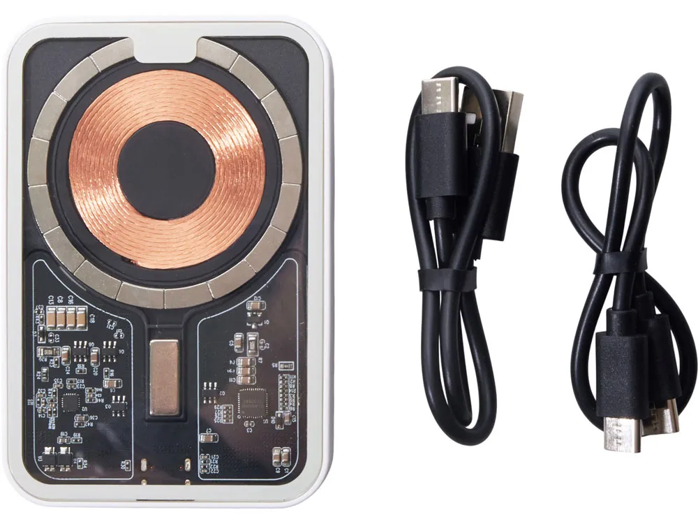 Беспроводной магнитный внешний аккумулятор MagnifIQ — технологичный и стильный power bank с эффектной прозрачной передней панелью, сквозь которую видны мощные магниты, индукционная катушка и электронная начинка. Ёмкость 10 000 мА·ч обеспечивает до 2–3 полных зарядов смартфона, а поддержка быстрой беспроводной зарядки до 15 Вт (с совместимостью QC/PD) делает процесс зарядки максимально быстрым и удобным. Двунаправленный USB-C порт позволяет как заряжать другие устройства, так и сам аккумулятор. Обе стороны корпуса подходят для нанесения логотипа: лицевая — через прозрачную панель, задняя — на приятное на ощупь soft-touch покрытие. Компактный, надёжный и сильный — идеальный технологичный продукт для продвижения и ежедневного использования. Поставляется в качественной упаковке с шубером, Двунаправленный кабель USB-C и кабель USB-A – USB-C в комплекте. • Прозрачная передняя панель — демонстрирует внутреннюю «начинку» и подчеркивает технологичность бренда. • Магнитная беспроводная зарядка 15 Вт • Ёмкость 10 000 мА·ч — хватает на несколько полных зарядов смартфона. • Двунаправленный USB-C — универсальность для зарядки и подзарядки. • Две зоны нанесения логотипа: на прозрачную панель спереди и на soft-touch покрытие сзади. • Сильные магниты обеспечивают надёжную фиксацию на совместимых устройствах.