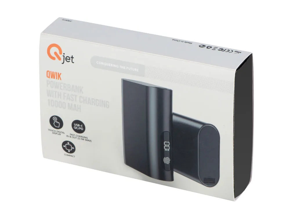 Qwik — пауэрбанк с возможностью супер быстрой зарядки 22.5 Вт от бренда Qjet. Благодаря двухстороннему разъему USB Type-C заряжает быстро как другие устройства, так и может быстро заряжаться сам (при наличии адаптера с поддержкой быстрой зарядки). Выполнен в лаконичном дизайне, имеет сенсорный дисплей для отображения уровня оставшегося заряда. Прочный металлический корпус. Компактный размер. В комплекте двунаправленный кабель USB-C с поддержкой быстрой зарядки и кабель для проводной зарядки iPhone USB - Lightning. • USB-C с поддержкой быстрой зарядки на вход 18 Вт и на выход 22.5 Вт • Быстрая зарядка смартфона по USB-A QC/PD до 18 Вт • Сенсорный дисплей • Компактный металлический корпус