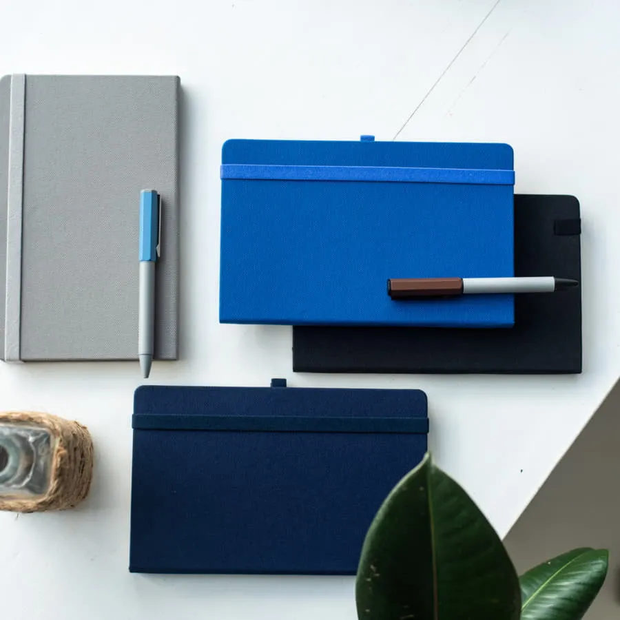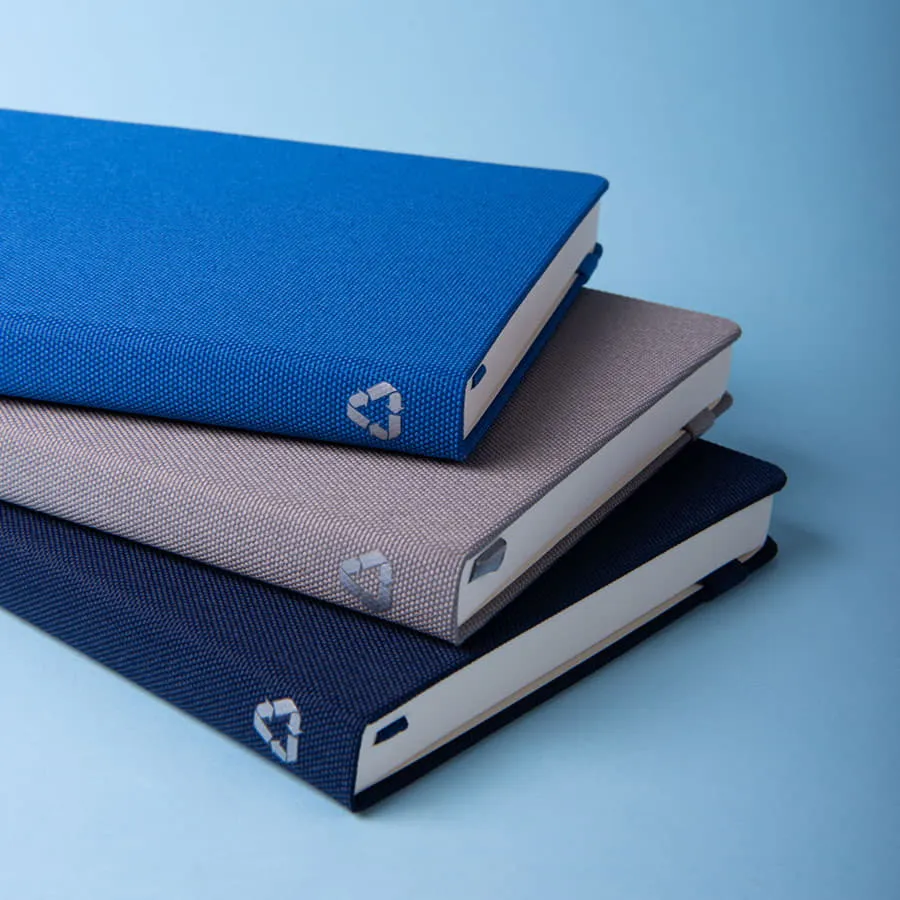 100% эко-блокнот Размер: 130х210 мм Переплет: твердый Обложка: RPET рециклированный полиэстер, полученный из переработанных пластиковых бутылок Материал сертифицирован в Нидерландах по Global Ecological Standard Отделка: жаккардовая резинка 12 мм и пенхолдер в тон обложки Форзац нахзац: кремовый Блок: недатированный Разлиновка: в линейку Количество страниц: 256 Углы блока: скругленные Цвет бумаги: кремовый Плотность бумаги: 70г м2 Ляссе: в тон обложке Карман для визиток: есть Упаковка: фирменный сливбокс thINKme