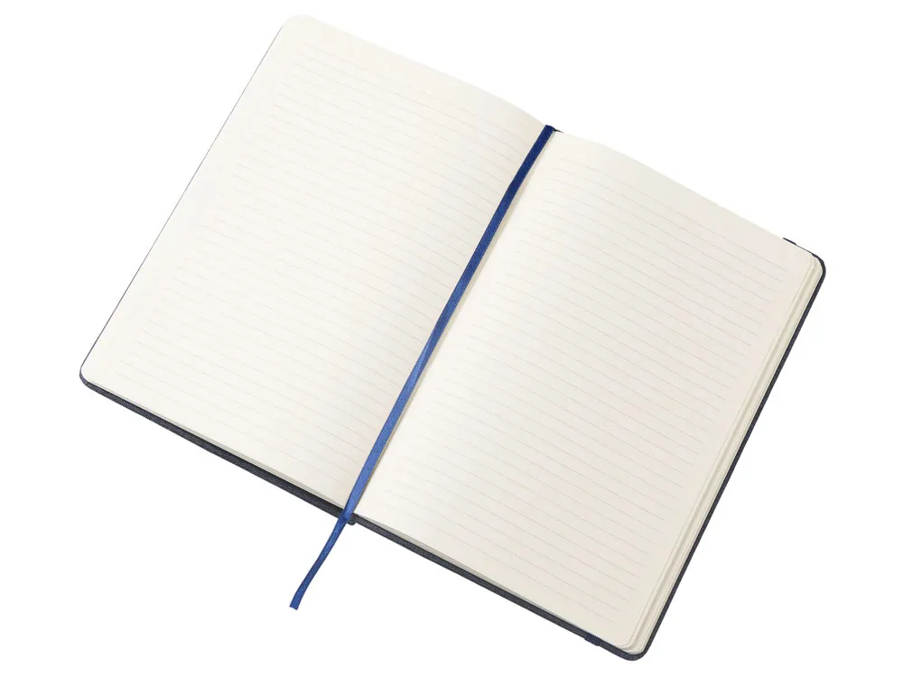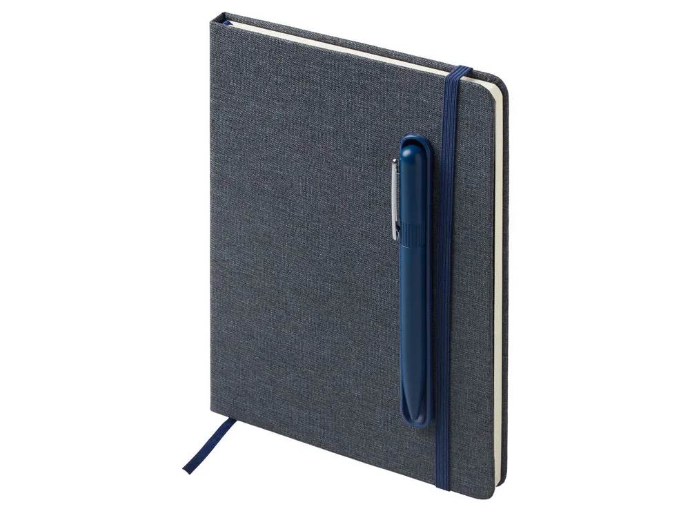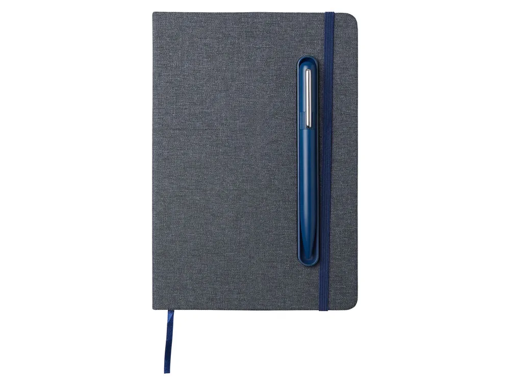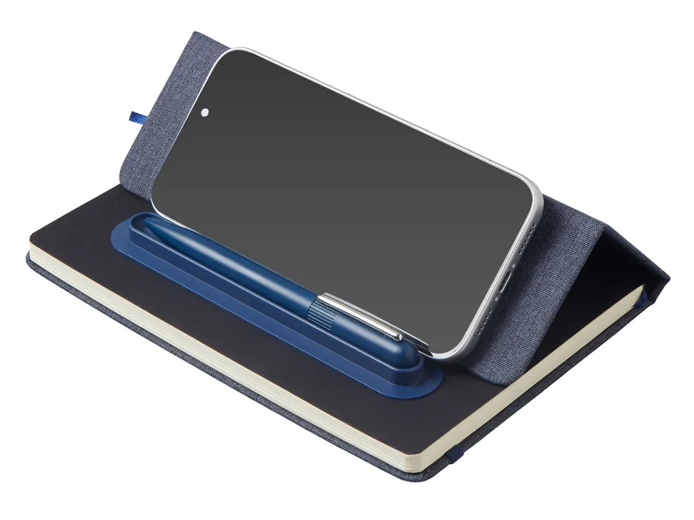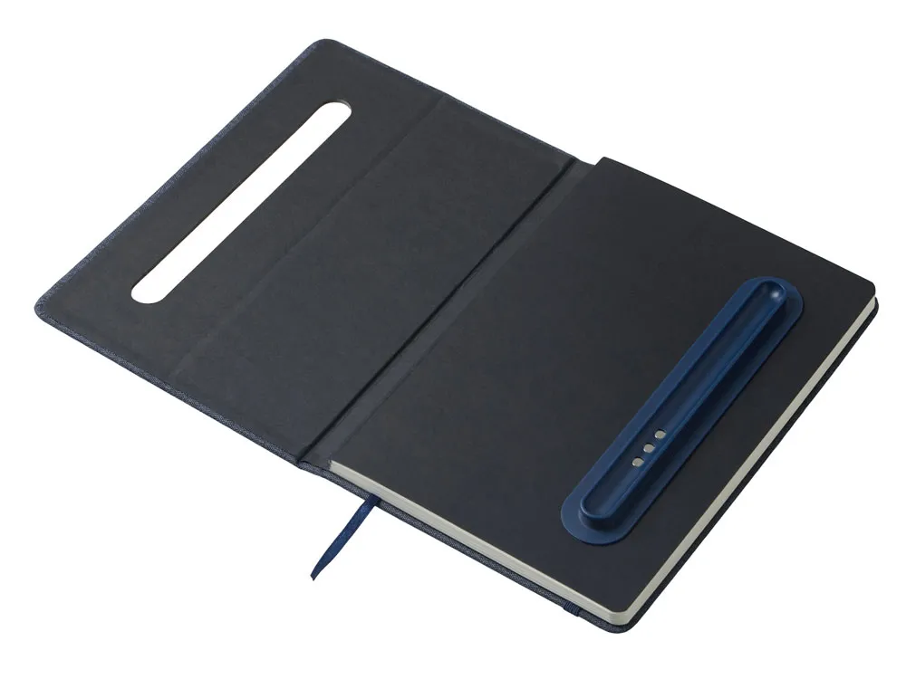 Блокнот в твердой обложке из rpet-пластика с металлической шариковой ручкой. В обложке магнитный держатель для ручки. Также верхняя часть обложки трансформируется в подставку для телефона. В блокноте 80 листов бумаги 70 г/м2.