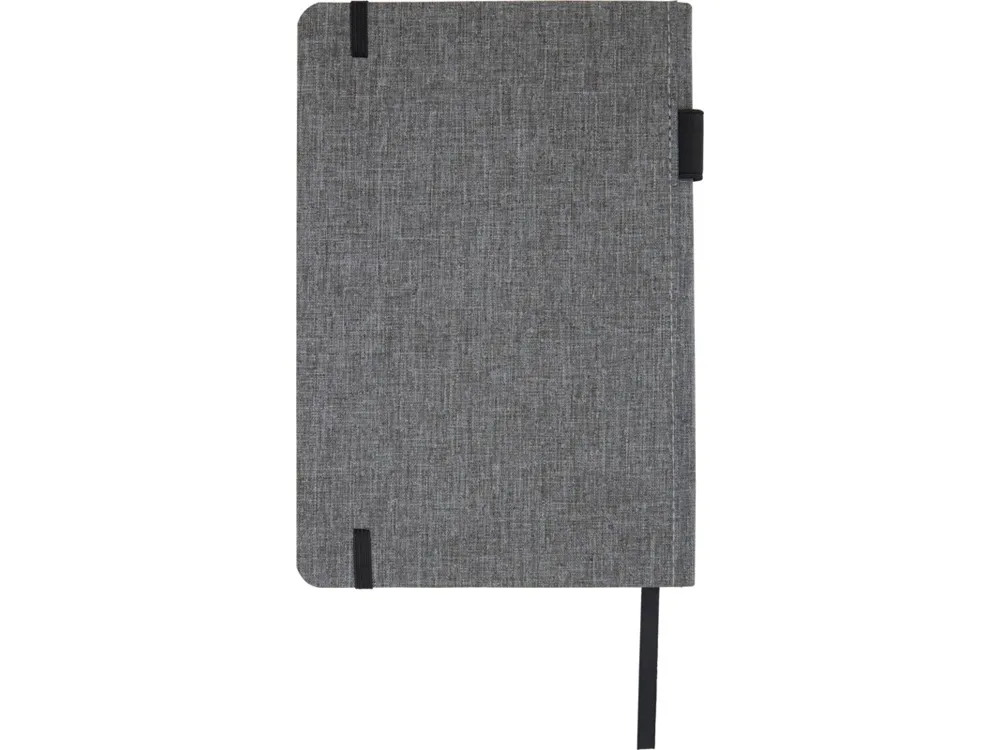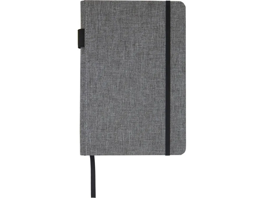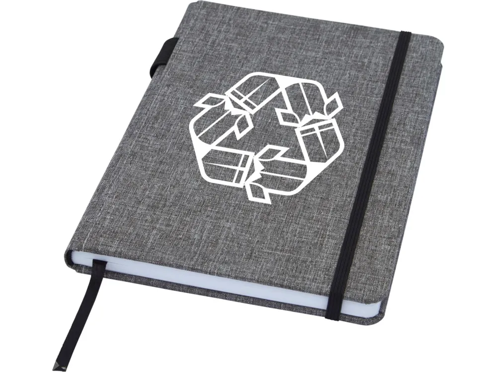 Блокнот формата А5 с отделкой из переработанного ПЭТ. Содержит 96 листов в линию плотностью 70 г/м², изготовленных из переработанной бумаги, с петлей для ручки и лентой-закладкой. В упаковке из картона.