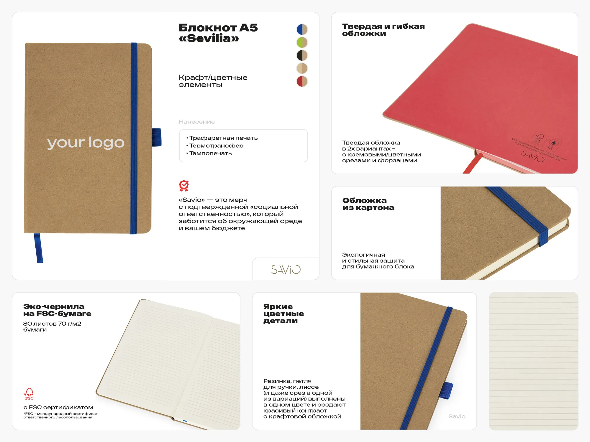 Sevilia от Savio — блокнот с твердой обложкой из крафта, закрывающийся на вертикальную резинку. Для удобства использования предусмотрены ляссе и петелька для ручки, совпадающие по цвету с резинкой. Бумажный блок выполнен из бумаги, полученной из древесины из специальных восполняемых лесных ресурсов, имеет сертификат FSC, международной некоммерческой организации лесного попечительского совета. Линовка — линия, выполнена специальными экочернилами, при изготовлении которых используется меньшее количество энергии. - 80 листов - твердая обложка обеспечивает защиту бумажного блока и прочность конструкции - бумага из восполняемых лесных ресурсов - петелька для ручки - экочернила - ляссе обложки для быстрой навигации