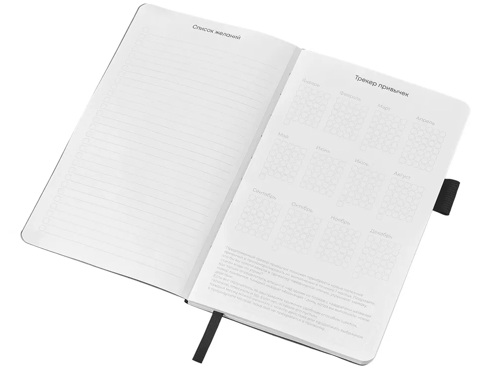 Стильный блокнот в гибкой обложке из текстурной искусственной кожи, приятной на ощупь. 96 очень приятных на ощупь листов повышенной гладкости с FSC-сертификатом обеспечивают комфортное письмо и аккуратный вид записей. Необычный для блокнота вводный блок включает трекер привычек, списки книг и фильмов, а также 4 страницы для раскрашивания с картинками и мандалами. Продуманные детали — резинка для закрытия, петля для ручки и ляссе — делают использование максимально удобным. Благодаря конверту для мелочей вам всегда будет куда положить визитки, записки и другие мелочи. Идеальный вариант для выстраивания баланса между работой и отдыхом.