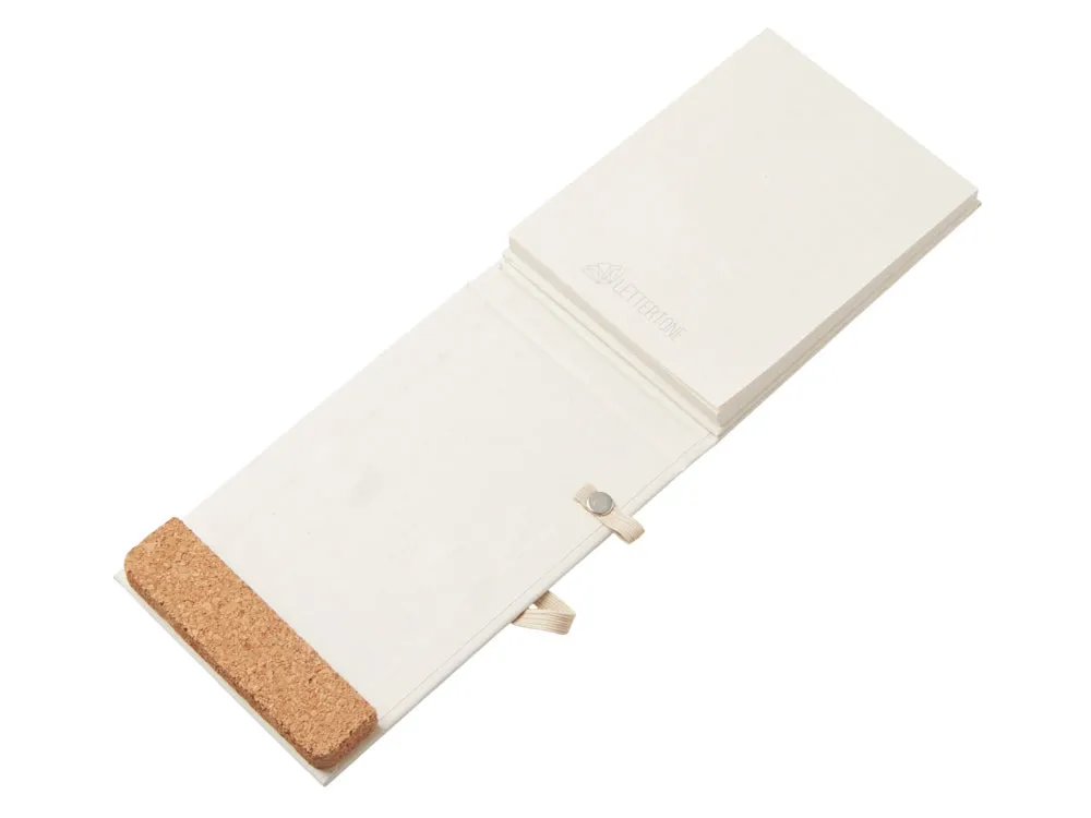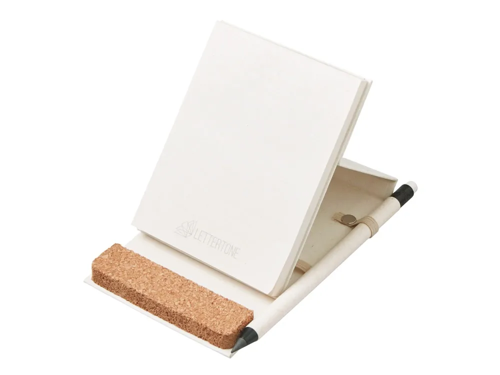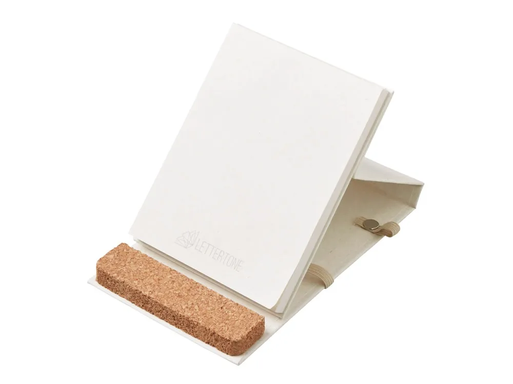 Удобный блокнот-репортер из переработанных тетрапаков с фиксирующей резинкой и петлей для ручки. Пробковое основание может как фиксировать блокнот в стоячем положении, так и стать подставкой для телефона на рабочем столе. В блокноте 70 листов плотностью 80 г/м2 бумаги из переработанных тетра-паков. Пишущий инструмент в комплект не входит.