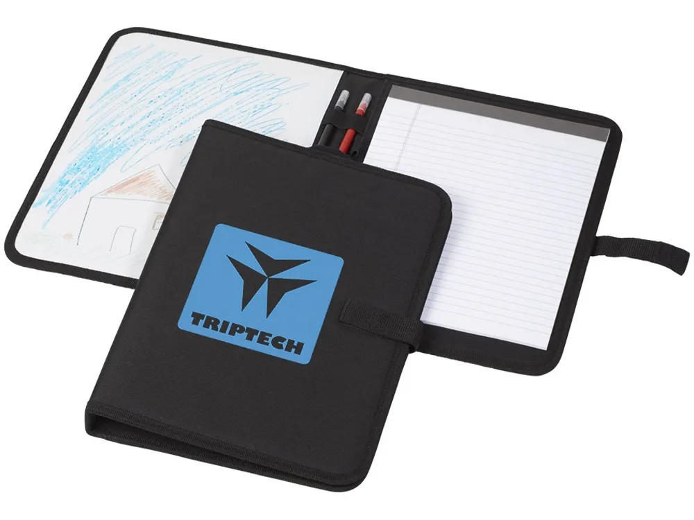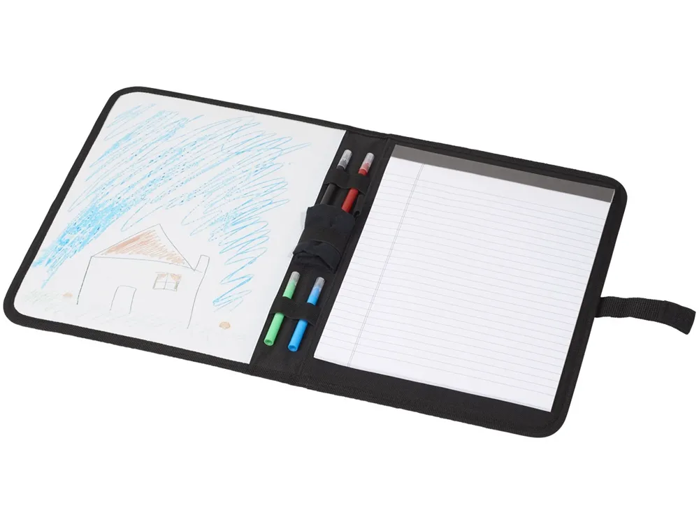 Папка Veela A4. Папка A4 с текстильной застежкой. Включает блокнот с 30 страницами линованной бумаги и доску. В комплект входят маркеры и салфетки. Полиэстер 600D.