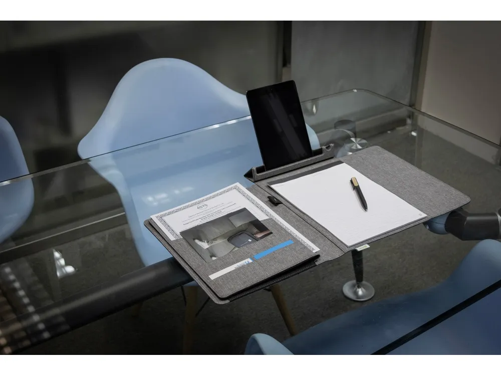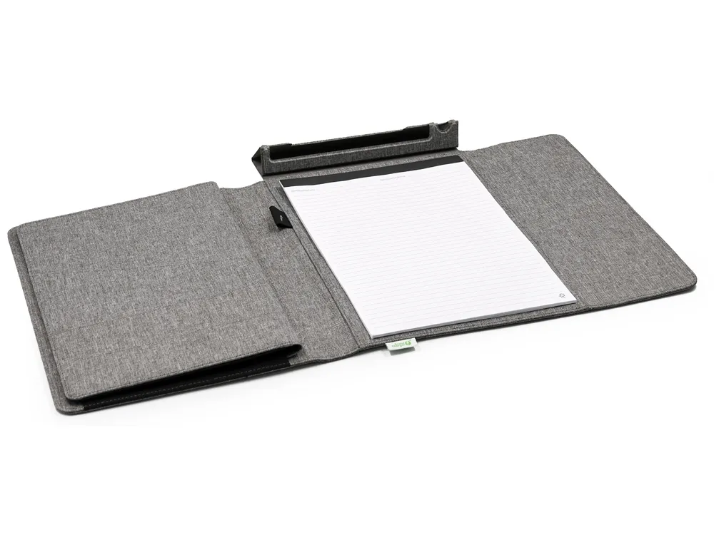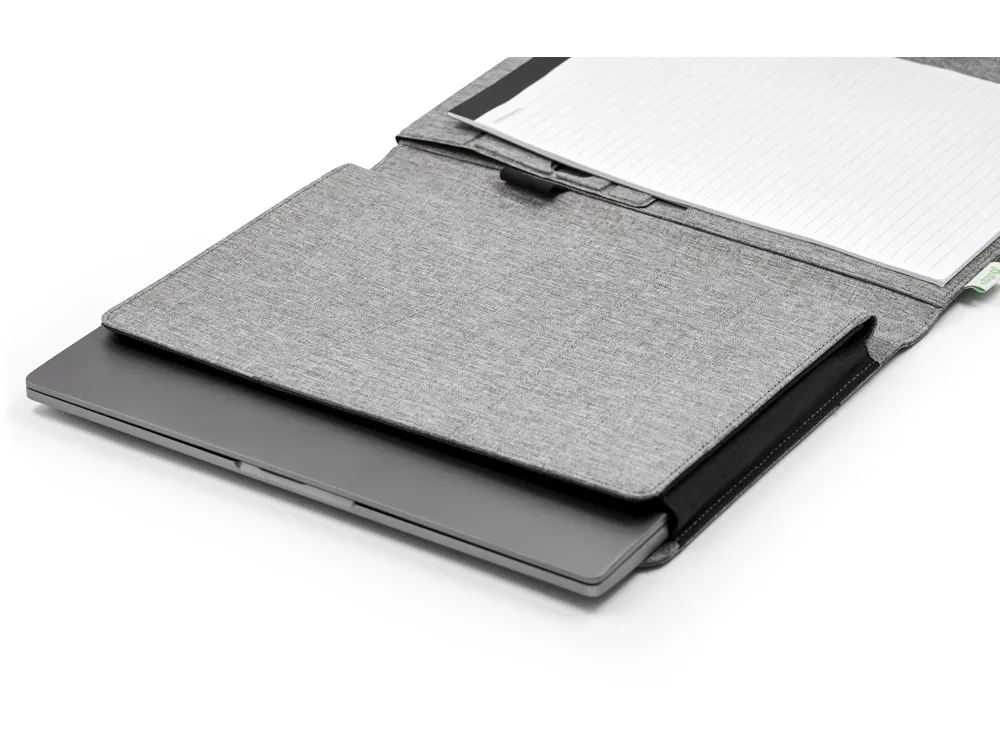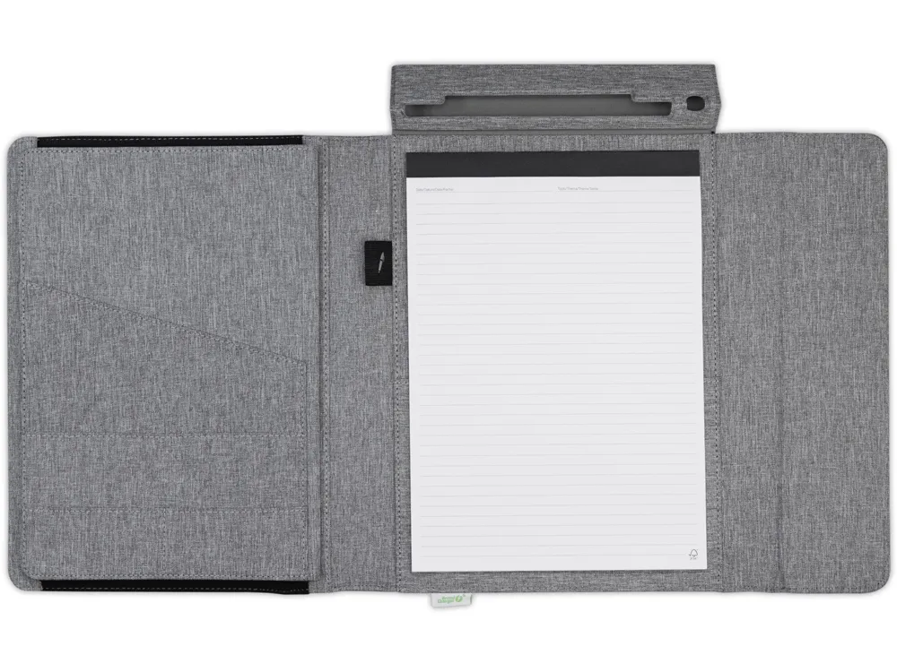 Папка-портфолио "NotyFolio Eco" от Brand Charger- удобный органайзер с отделением для ноутбука диагональю 13" и подставкой для телефона и ручки. Обложка выполнена из переработанного пластика (RPET). Внутри папки 20 листов FSC бумаги плотностью 80 г/м2, изготовленной с соблюдением экологических норм. Также есть петля для ручки и карманы для важных бумаг и банковских карточек и/или визиток. - плотная твердая обложка не даст бумагам помяться; - несколько карманов разного размера; - отделение для ноутбука диагональю 13"; - петля для ручки; - 20 листов А4.