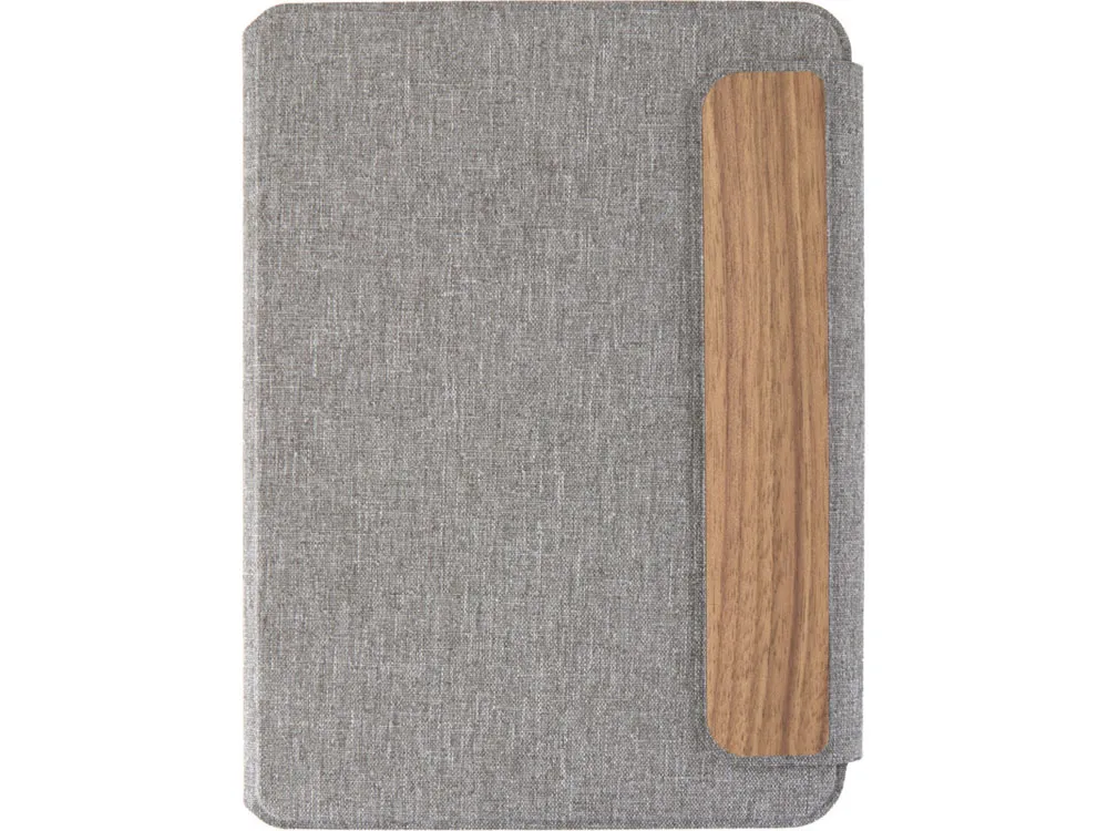 Обложка портфолио A5 Andean изготовлена из переработанного полиэстера, сертифицированного RCS, что является экологичной альтернативой стандартным материалам. Изделие имеет гладкую серую обложку с закругленными углами, а также магнитную застежку, дополненную изысканной деталью из орехового дерева, что придает ему изысканный вид. Внутри блокнот в гибкой обложке с 64 листами бумаги 80 г/м2 кремового цвета в линейку. Поставляется в шубере из крафтовой бумаги