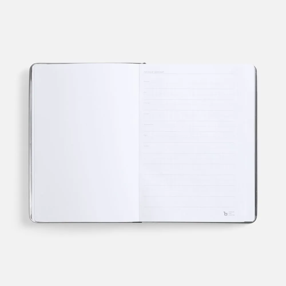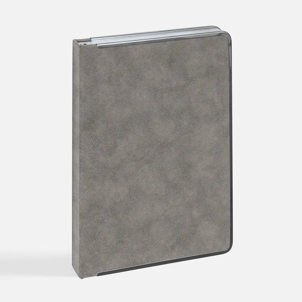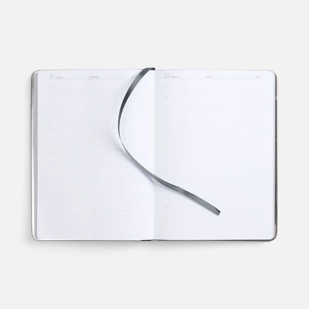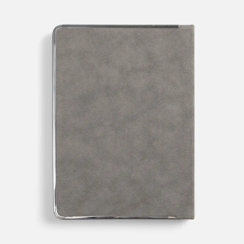 Ежедневник с твердой обложкой и серебристым обрезом блока. Выполнен из материала Nubuck, серый СС, дополнен серым ляссе и металлическими рамками с двух сторон обложки.