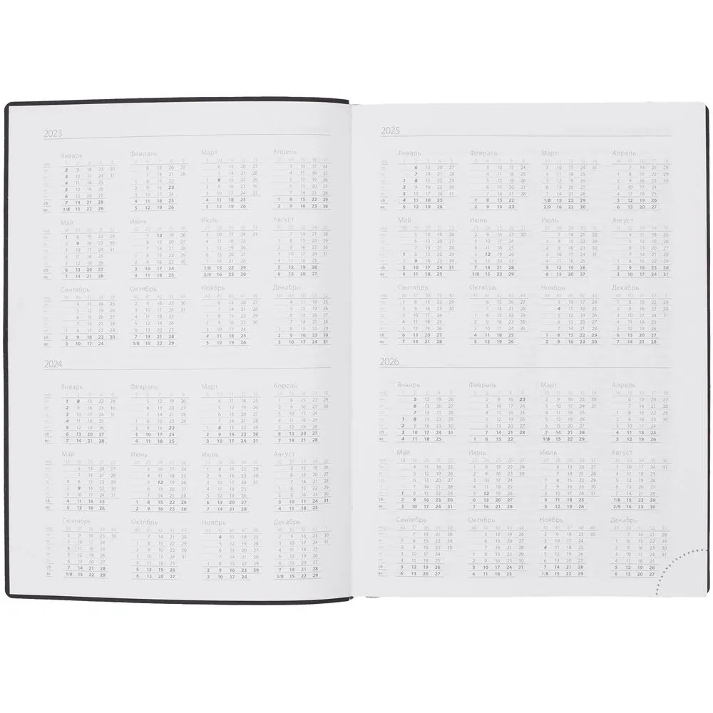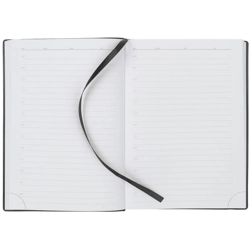 Ежедневник с гибкой обложкой, выполнен из материала Latte, темно-синий НН, дополнен резинкой шириной 1 см, капталом и ляссе темно-синего цвета.