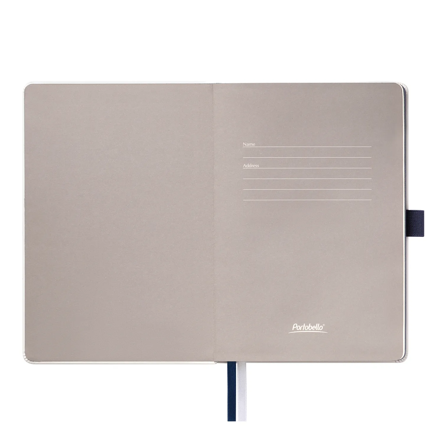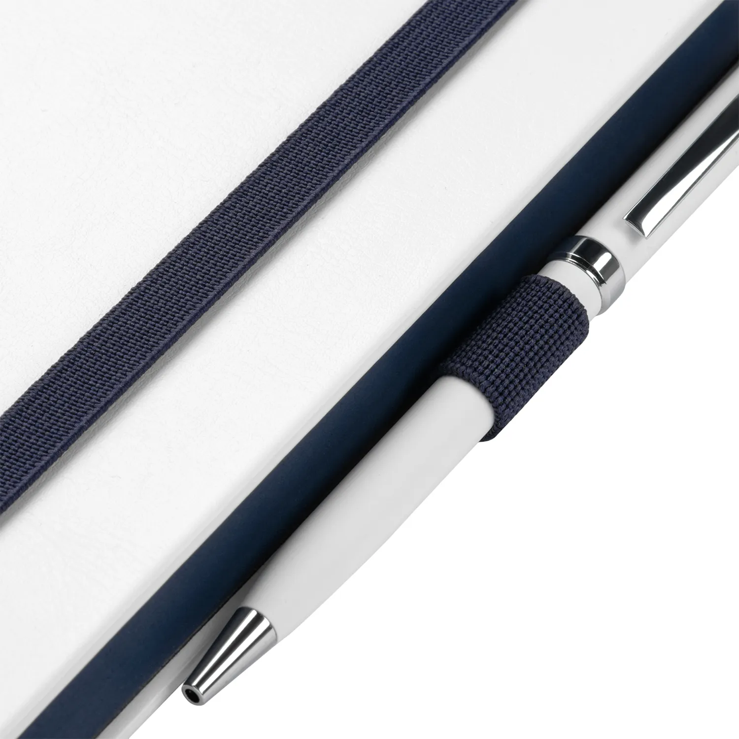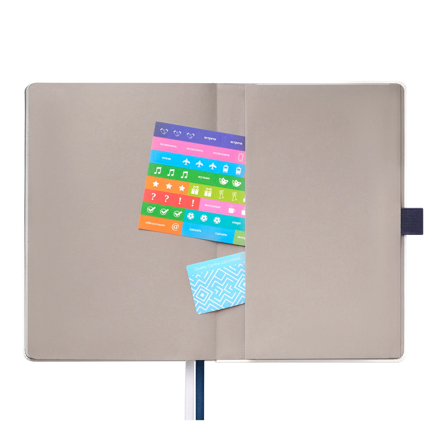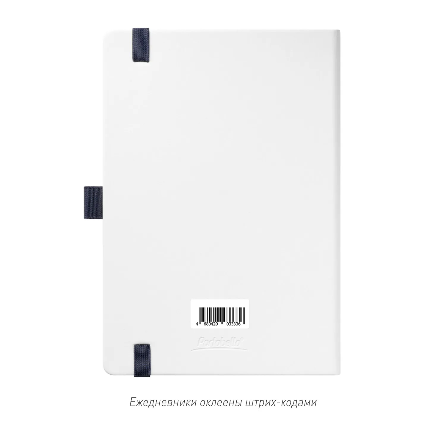 Недатированный ежедневник выполнен в жесткой обложке из искусственной кожи со скругленными уголками. Переплетный материал гладкий, с легкой естественной паутинкой морщин, имеет полуглянцевый блеск. Цвет – чистый белый. Серые матовые форзац и нахзац, а также серо-бежевый срез блока создают оригинальный динамичный цветовой ансамбль и подчеркивают белизну обложки. Страницы светло-кремового цвета, из гладкого офсета, слегка шелковистые, со скругленными уголками. Добавляют изделию мягкую комфортную теплоту. Двойное атласное ляссе составлено из серой и белой лент. Каждая шириной 6 мм, имеет легкий блеск. Вертикальная фиксирующая резинка прочная, надежная и удобная, в тон срезу. Есть петелька для ручки в тон резинки. Карман на заднем форзаце.