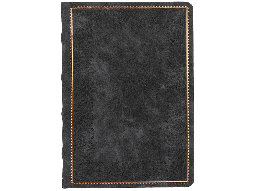 Недатированный ежедневник "Royal" формата А5 с твердой обложкой из искусственной кожи с имитацией нубука украшен художественным бронзовым и блинтовым тиснением. Внутри 256 страниц, выполненных из качественной бежевой бумаги в линейку плотностью 100 г/м². Два шелковых ляссе в цвет обреза блока и обложки облегчают навигацию по записям. Французский корешок дополнительно декорирован изящным бронзовым тиснением в виде виньеток. Скругленные углы обложки и блока подчеркивают стильный дизайн изделия, а блеск бронзового обреза дарит ежедневнику благородный и роскошный внешний вид.