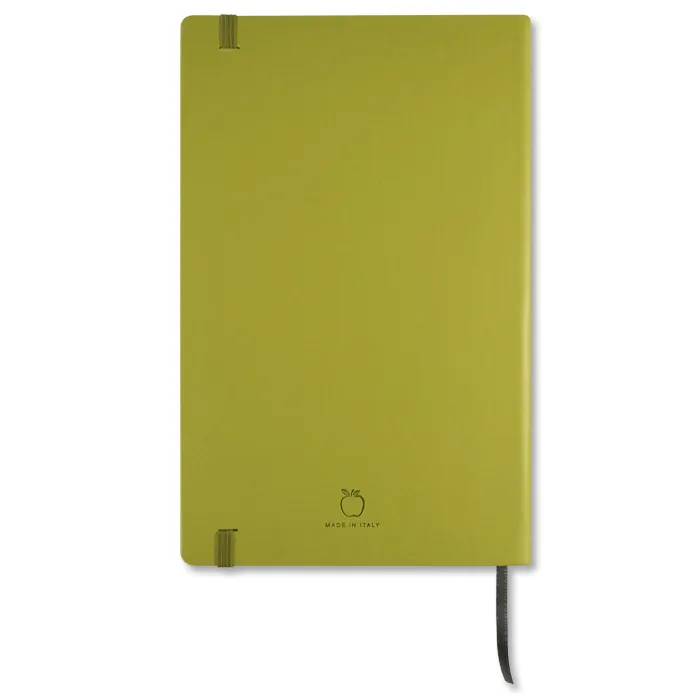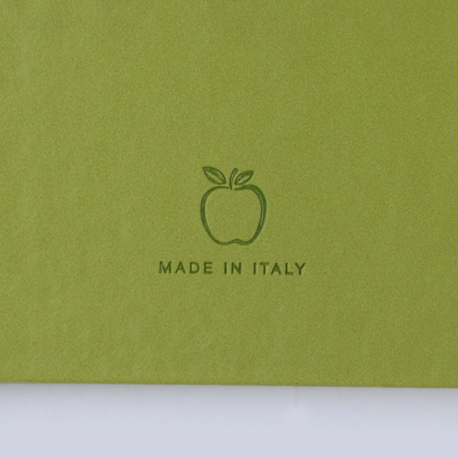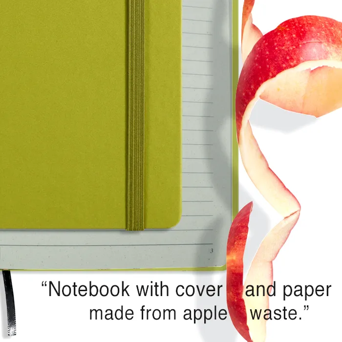 Яблочный блокнот APPLE SKIN II обложка и блок из кожуры яблок, внутр.формат 13х21 см. 192 страниц, яблочная бумага 80 г. Cертифицирована FSC. Печать в 1+1 цвет, все страницы пронумерованы. Шитый блок. Форцазы из яблочной плотной бумаги 140 гр FSC. Гибкая обложка с резинкой и ляссе в тон обложки. Экологичная обложка выполнена из высококачественного материала инновационной переработке промышленных остатков кожуры яблок. Обладает свойствами термоэффекта при слепом тиснении. Внутрений блок уникальный и имеет не только линованные страницы, но так же и КЛЕТКУ , и ТОЧКУ. в конце блока имеется отрывные листы с перфорацией. Главная идея сделать блок нумерованный где каждая страница имеет свой номер и вы можете строить свое оглавление в конце блока ( ИНДЕКС)