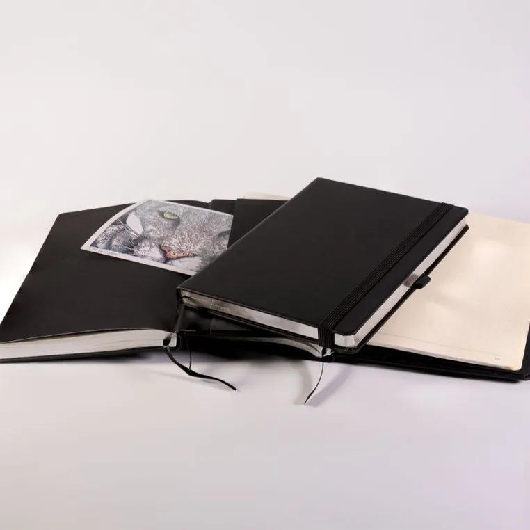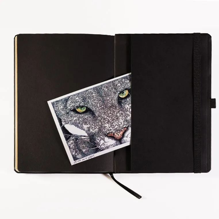 Записная книга формат 14,5х21 см в линейку 256 страниц, кремовая бумага 70 г сертифицирована FSC. Серебряный или золотой срез. Дополнительно имеются страницы в точку, в клетку, для систематизации проектов, а также листы без разметки с перфорацией. Печать в 1+1 цвет, все страницы пронумерованы. Шитый блок Форцазы из черной дизайнерской бумаги 140 гр FSC. Карман из черной дизайнерской бумаги . Обложка из премиального кожзама от ведущего итальянского производителя. Ляссе в тон обложки. Резинка 10 мм в тон обложки.