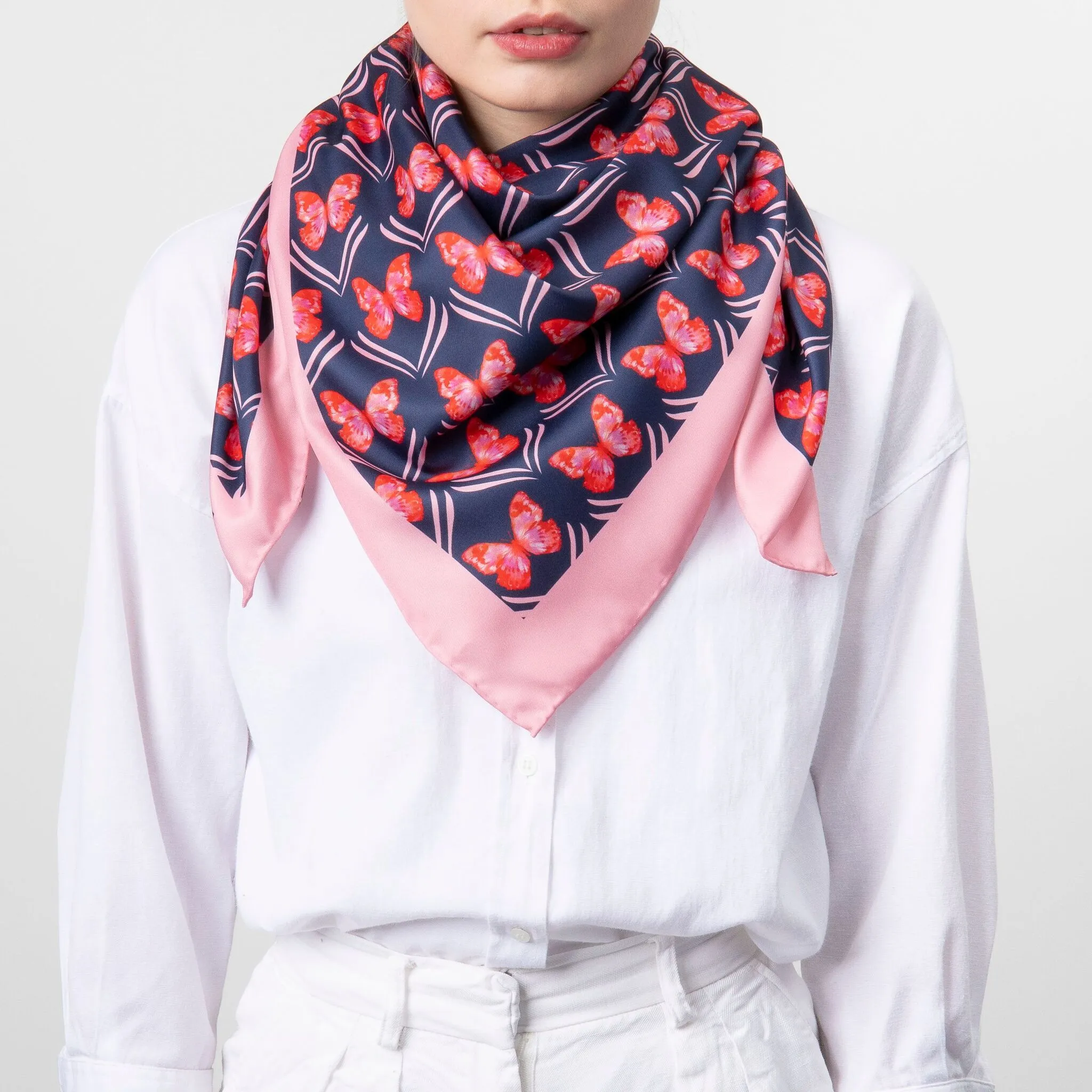 Платок Pontia напечатан свежими и романтичными бабочками, сублимированными контрастной цветной рамкой. Этот шарф изготовлен из веганского шелка (синтетического), а его размер 90/90 см делает его трендовым must-have этого сезона.