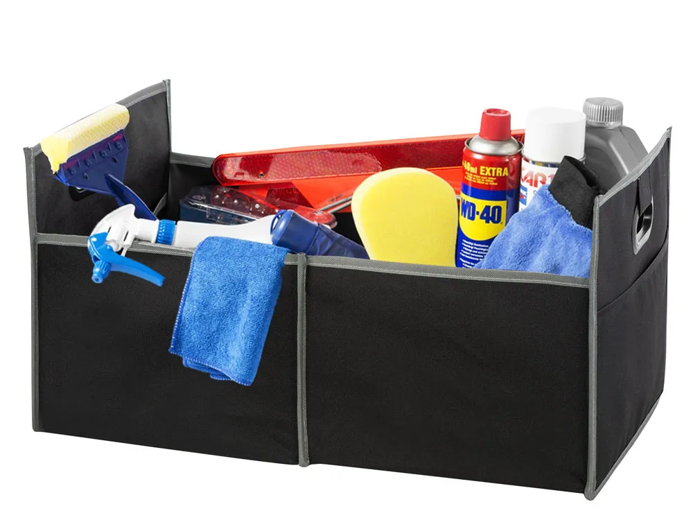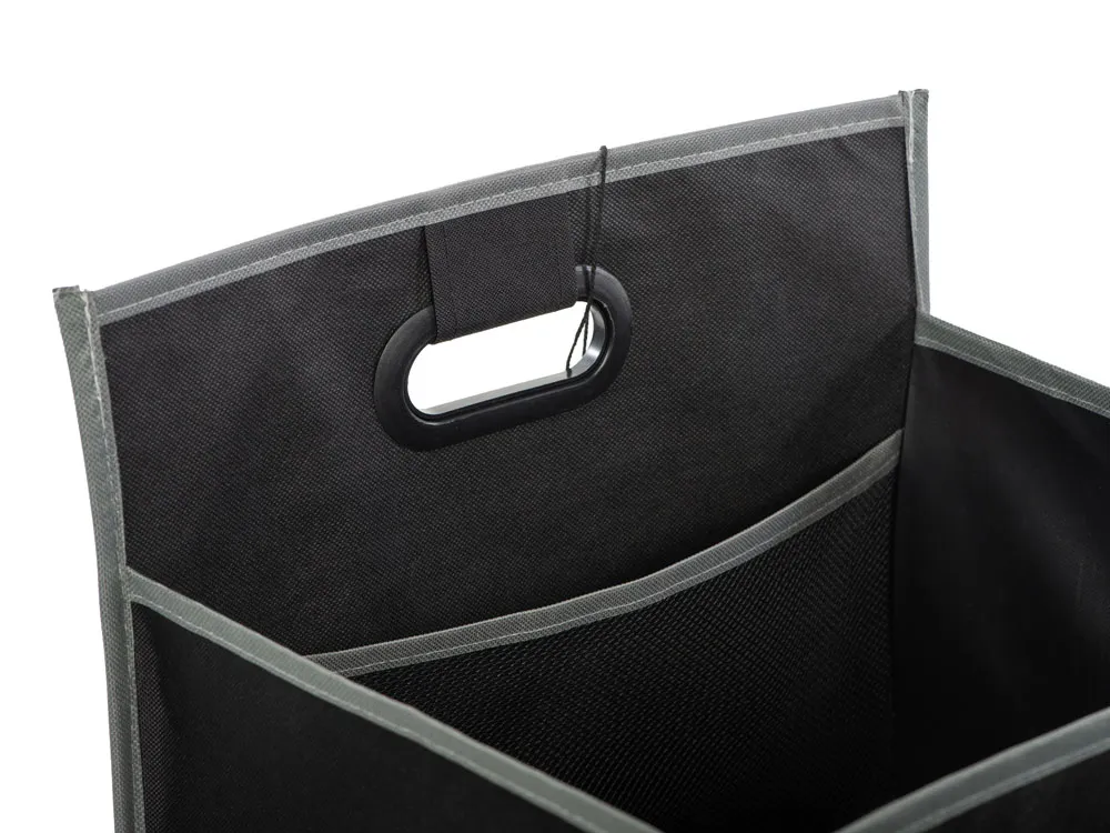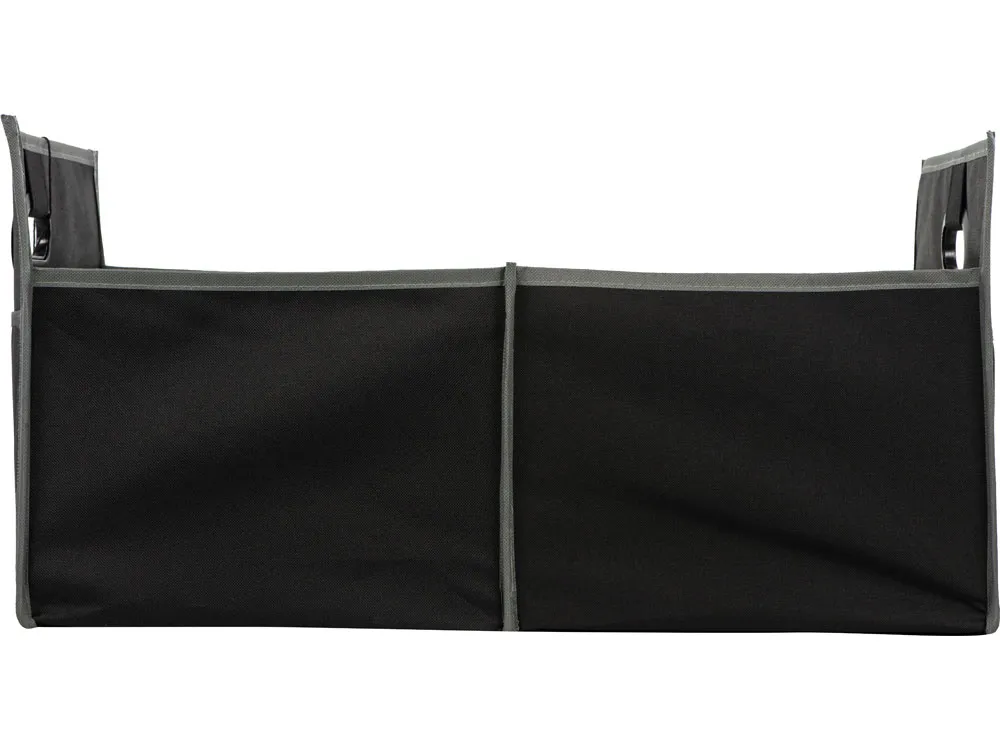 Органайзер для багажника помогает содержать в чистоте автомобиль и аккуратно складывается для хранения во время его неиспользования. Имеет два наружных кармана для дополнительных вещей и два внутренних отделения. Ручки с мягкими подкладками для удобной переноски.