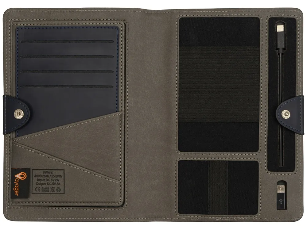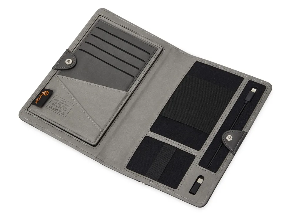 Органайзер с внешним аккумулятором выполнен из PU-кожи – прочного, устойчивого к механическим нагрузкам материала. Выглядит элегантно и солидно, имеет мягкую текстуру, приятную на ощупь. Компактный стильный аксессуар удобно брать с собой на работу, в командировку, в путешествия. Это прекрасный подарок для любого человека, живущего в динамичном ритме. • Встроенный аккумулятор li-poly емкостью 4000 mAh позволяет не переживать, что телефон внезапно разрядится в неподходящий момент. • Двухсторонний micro USB-Lightning кабель в комплекте с насадкой USB-C дает возможность зарядить смартфон любого типа. • Специальные отделения позволяют держать под рукой флеш-накопитель с важными файлами, паспорт, карты, визитки и другие документы.