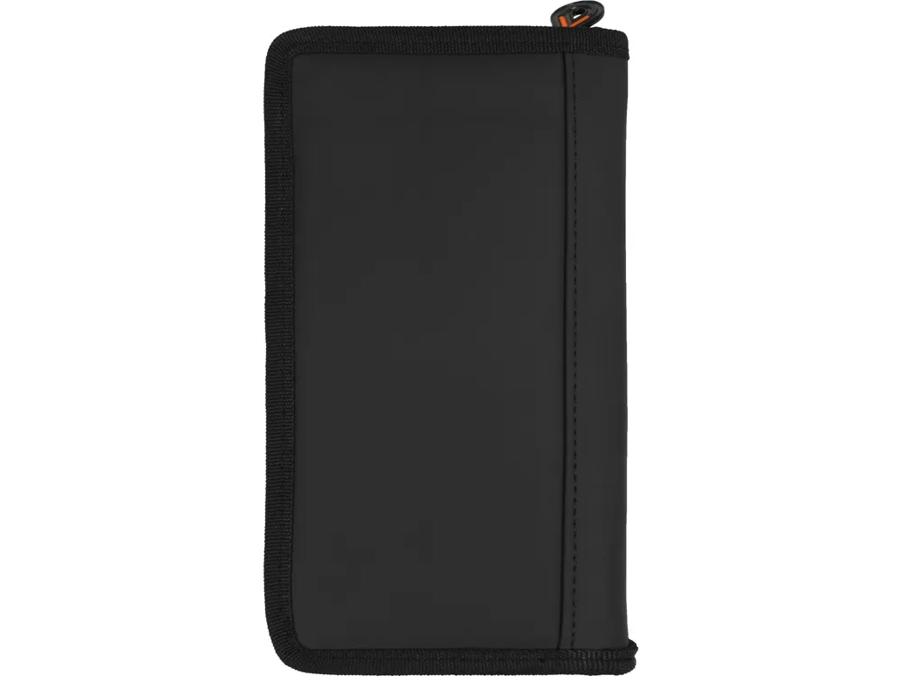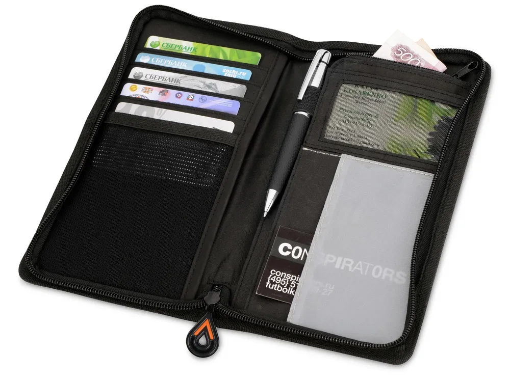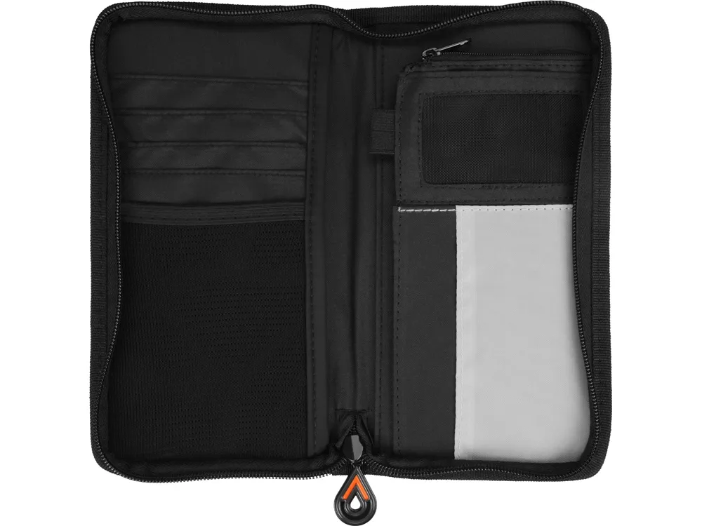 Портмоне для путешествий из прочного полиэстера сделает любую поездку более комфортной. Здесь предусмотрено место для паспорта, билетов и денег, кармашки для пластиковых карт, а также удобный держатель для ручки. Портмоне закрывается на молнию. Портмоне «Эдисон» – прекрасный подарок для тех, кто любит путешествовать и проводит много времени в разъездах.