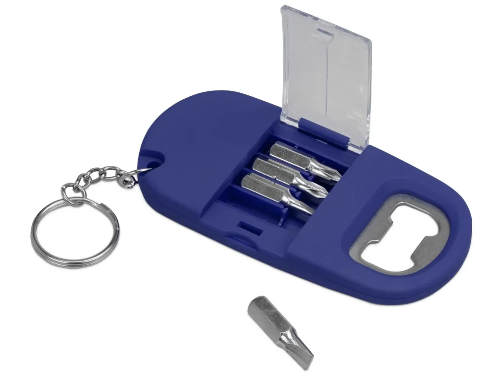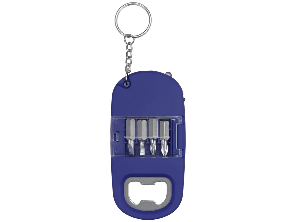 Брелок включает в себя 2 плоские и 2 крестообразные насадки, прочную металлическую открывалку и небольшой фонарик. Корпус сделан из плотного пластика с мягким покрытием soft-touch. Встроенный фонарик позволяет подсвечивать рабочую зону.