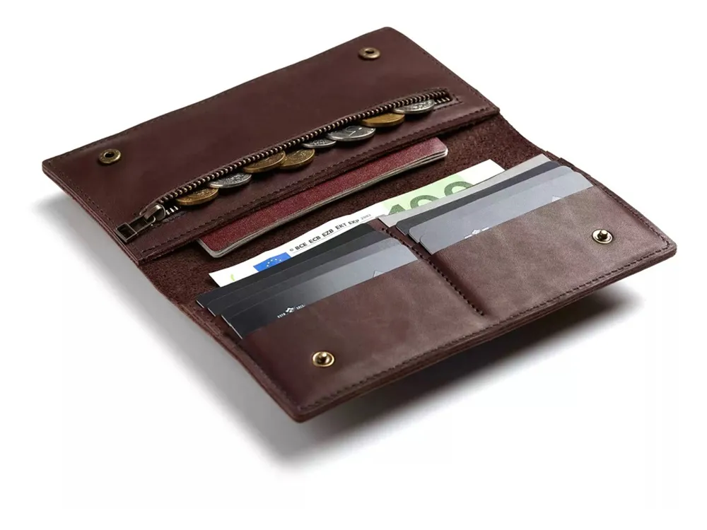 В меру строгий и универсальный, этот кошелек будет верным решением для людей, привыкших носить всё своё при себе. Из фурнитуры присутствует молния и надежные заклёпки. Плотная кожа готова к любым превратностям судьбы – от случайно пролитого кофе до ежедневного многолетнего ношения в разнообразных сумках и рюкзаках.