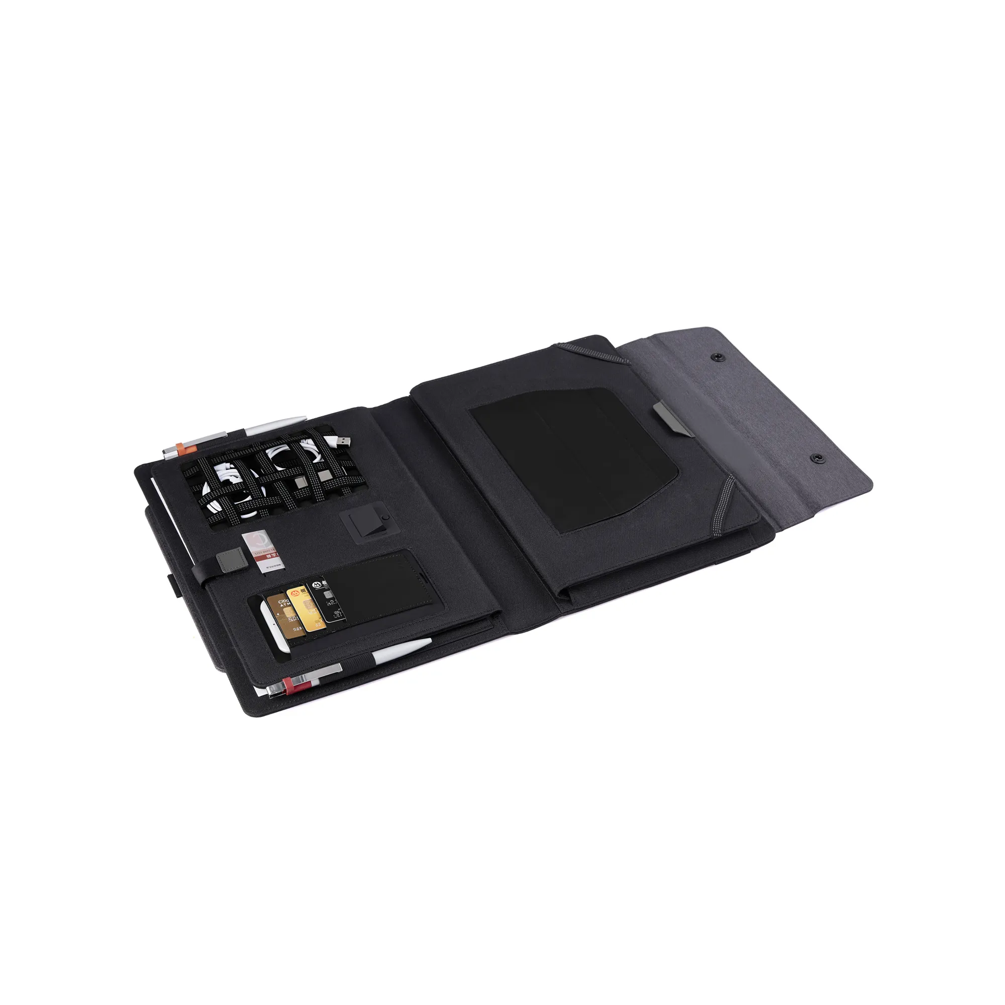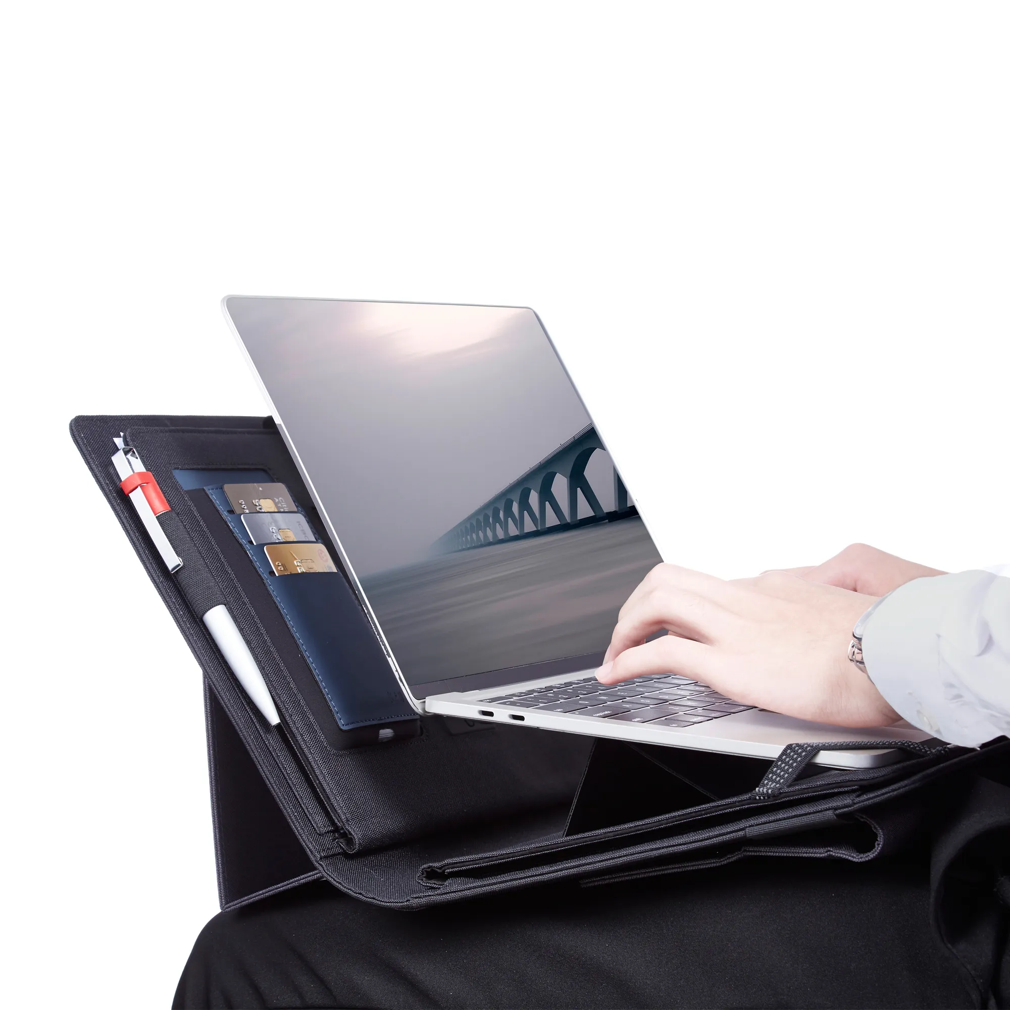 Папка 7429-4/3 оптимально подходит для планшетов и тонких ноутбуков (без CD-привода) с диагональю экрана до 15,6 дюймов. В мобильном офисе есть все необходимое для комфортной работы. Папка в разложенном виде образует горизонтальную площадку под ноутбук, см. дополнительное фото. Для мобильных устройств доступно 2 вида зарядки: беспроводная (Qi-технология) и стандартная - проводом от USB-разъема. Простое и удобное крепление на выдвижную ручку чемодана будет незаменимо в поездках. В закладке файлы есть видео с наглядной демонстрацией функционала мобильного офиса.