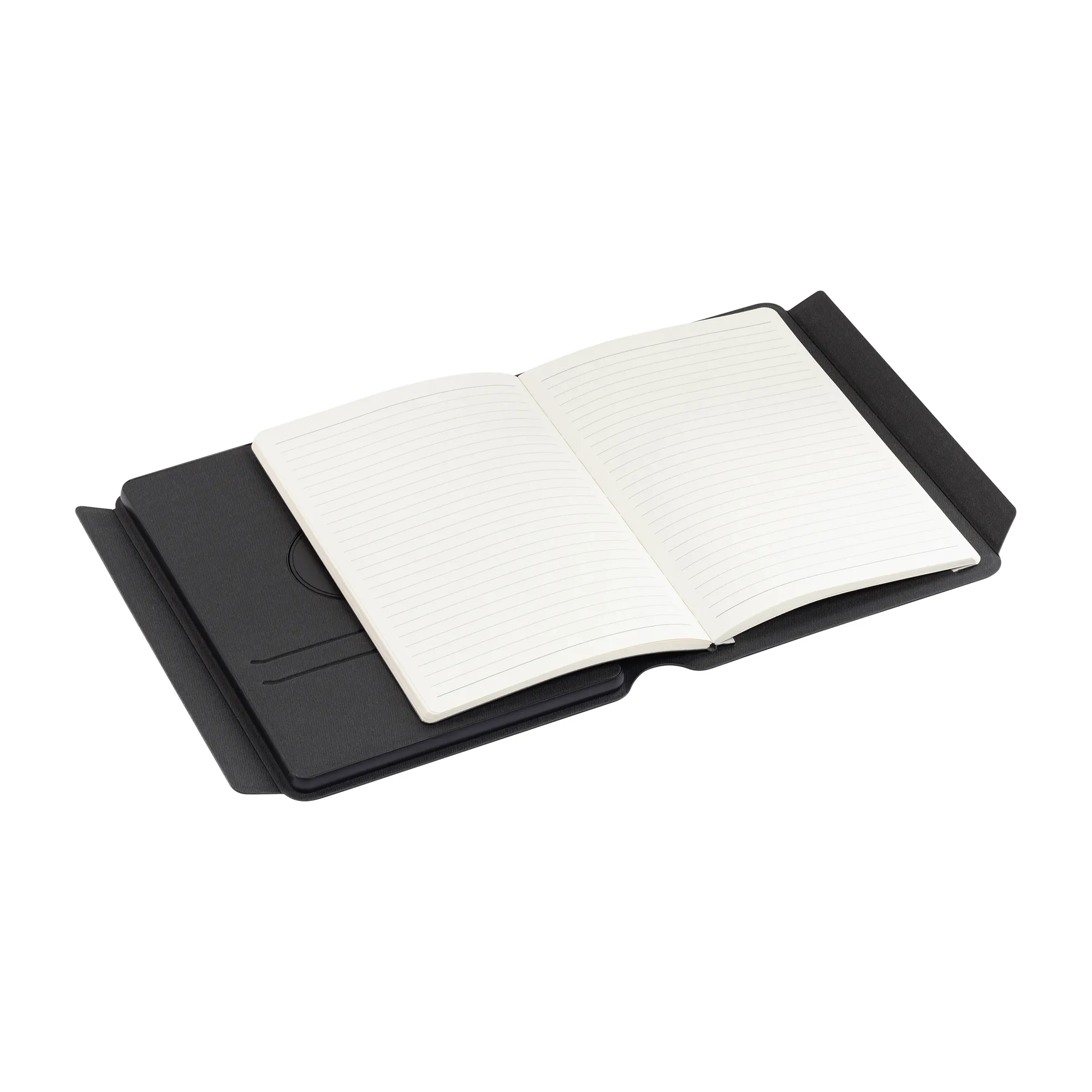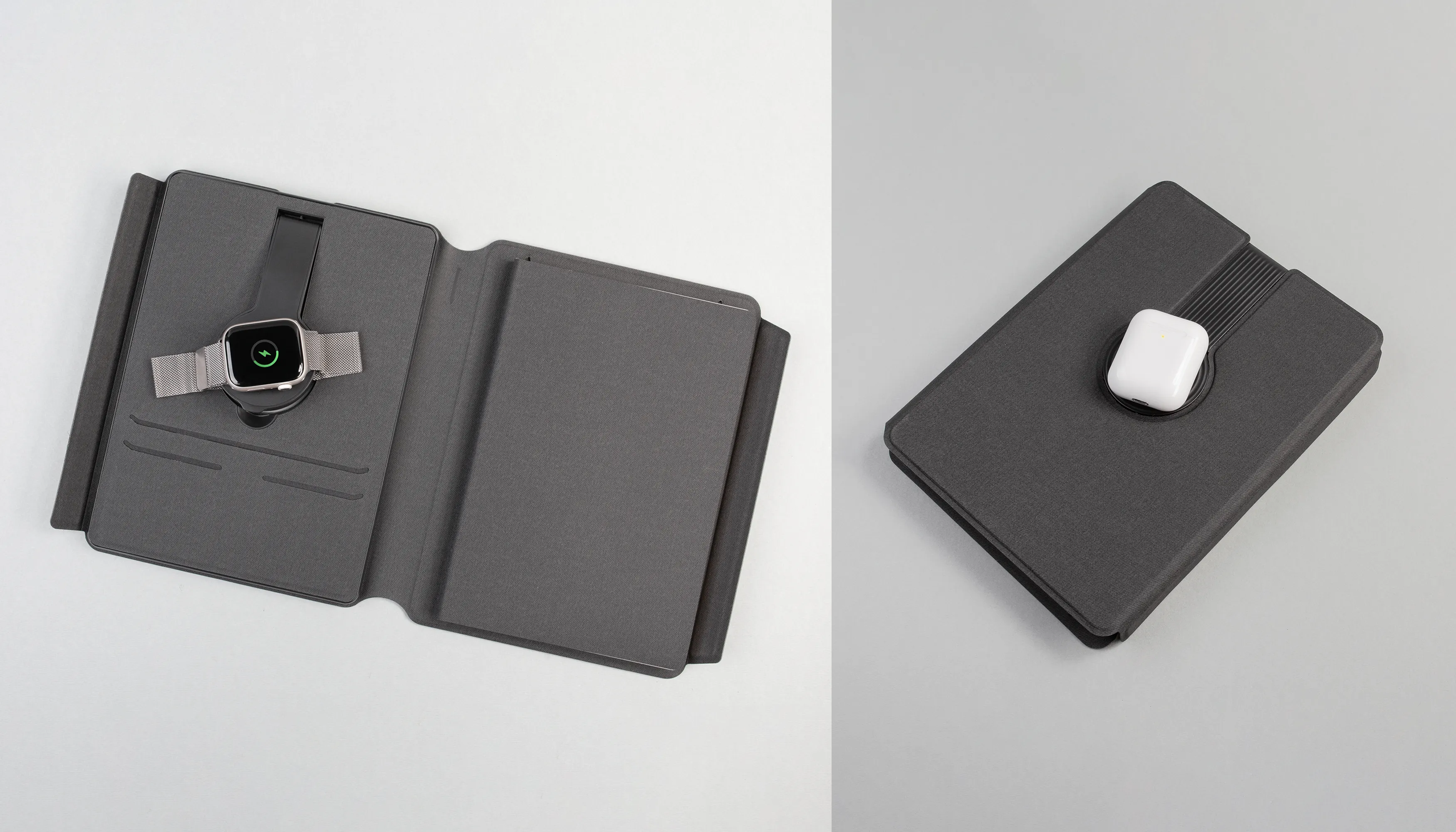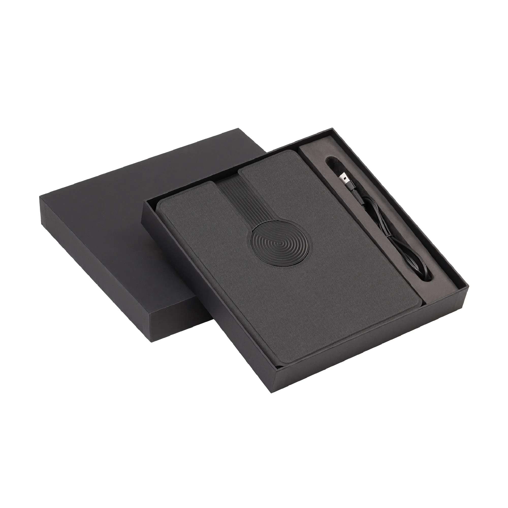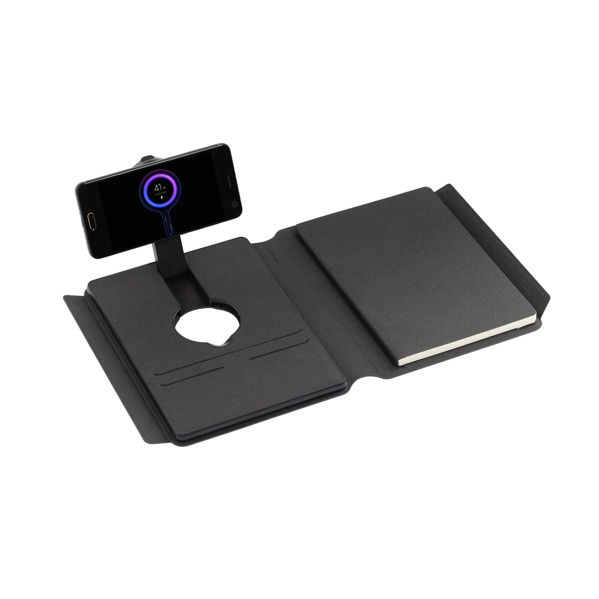 Нетривиальная конструкция двустороннего зарядного блока со встроенной магнитной функцией MagSafe позволяет заряжать беспроводным способом смартфоны, смарт-часы и наушники. Для проводной зарядки можно использовать разъём Type-C с индикаторами уровня заряда встроенной в папку батареи. В комплект входит съёмный блокнот А5 с мягкой обложкой (128 страниц в линейку кремовой бумаги плотностью 80гр./м2).