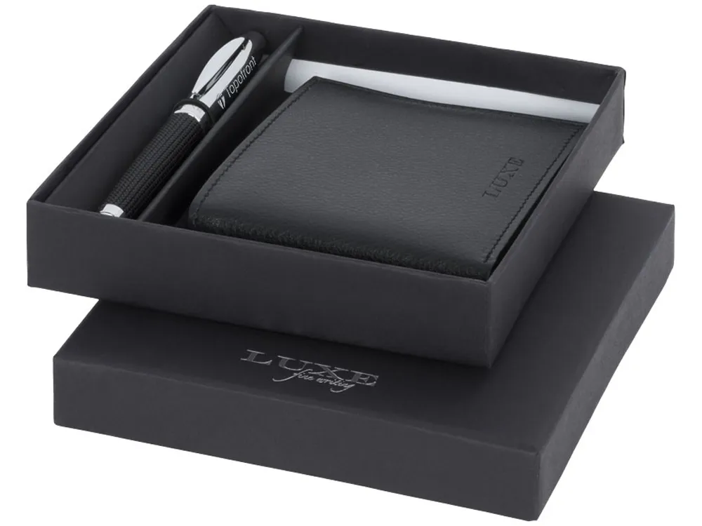 Подарочный набор из шариковой ручки и кошелька. Два необходимых предмета в одном стильном подарочном наборе. Шариковая ручка с кожаным покрытием с бумажником. Эксклюзивный дизайн. Предлагается в подарочной коробке LUXE. Металл и искусственная кожа.