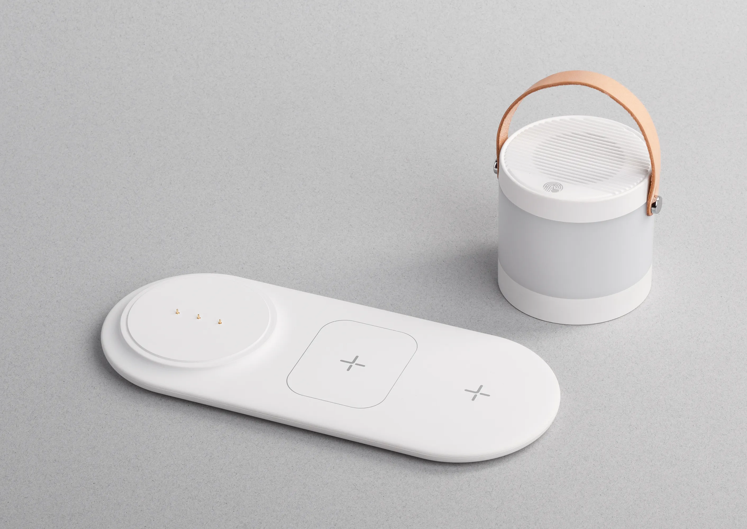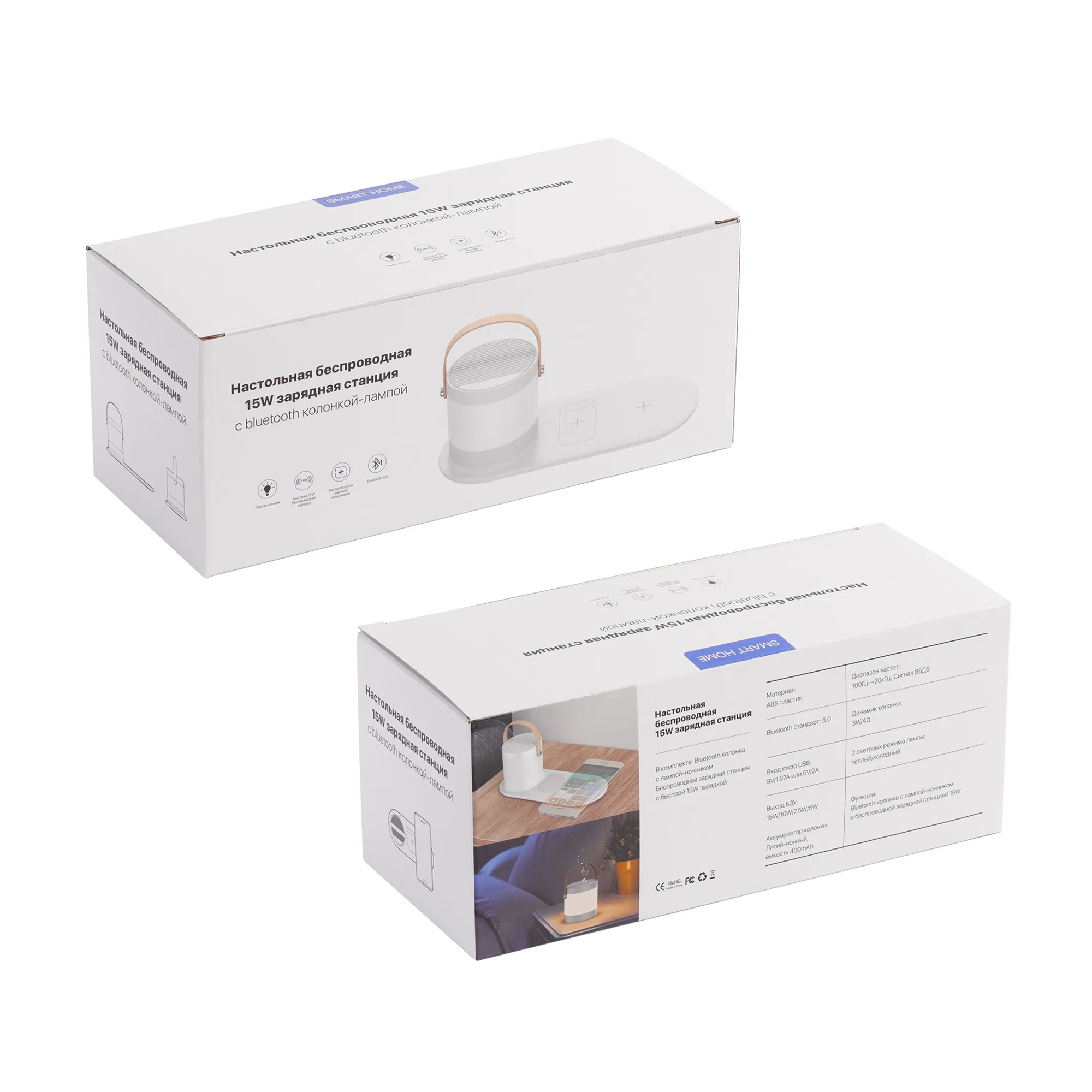 Настольный набор из мобильной bluetooth колонки-лампы и беспроводной зарядной станции с увеличенной мощностью передачи заряда (15W) для смартфона и наушников. Лампа-ночник управляется сенсорной кнопкой и имеет 2 режима светового потока – тёплый и холодный.