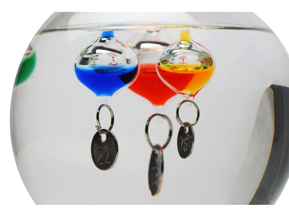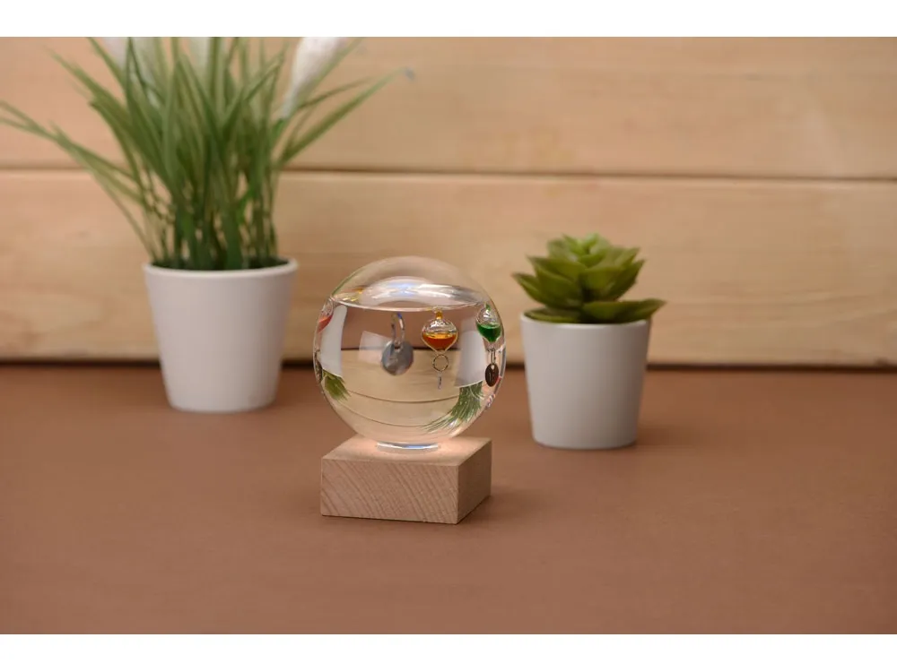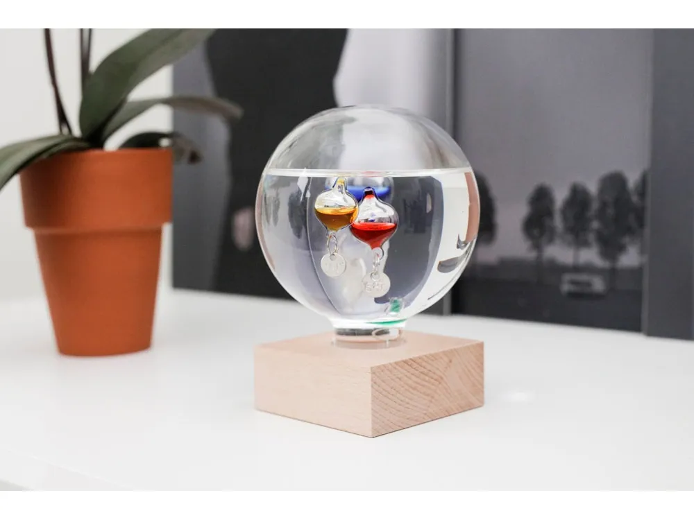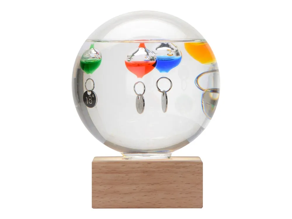 Термометр не только очаровательно выглядит, но и действительно функционирует как градусник внутри помещения с комнатной температурой. Определять погоду по нему очень просто: посмотрите, какой из стеклянных буйков находится ниже всего, именно такова температура окружающей среды. В основе действия этого круглого стеклянного термометра – принцип действия реально существовавшего и популярного в свое время термометра Галилея, который представлял, правда, не шарик, а высокую колбу с такими же стеклянными буйками, в каждом из которых – жидкость разной плотности. На каждом из буйков висит табличка с температурой, указанной в градусах Цельсия и Фаренгейта. Не укатиться шарику помогает деревянная подставка.