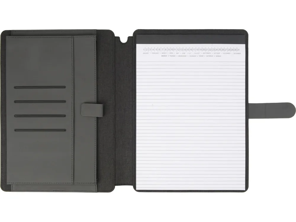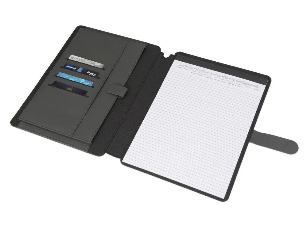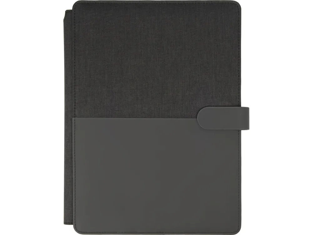 Стильная папка для документов формата А4 с комбинированной обложкой из текстиля и искусственной кожи. Удобный внутренний органайзер имеет карман на застёжке для планшета, блокнот для записей с линованной бумагой.