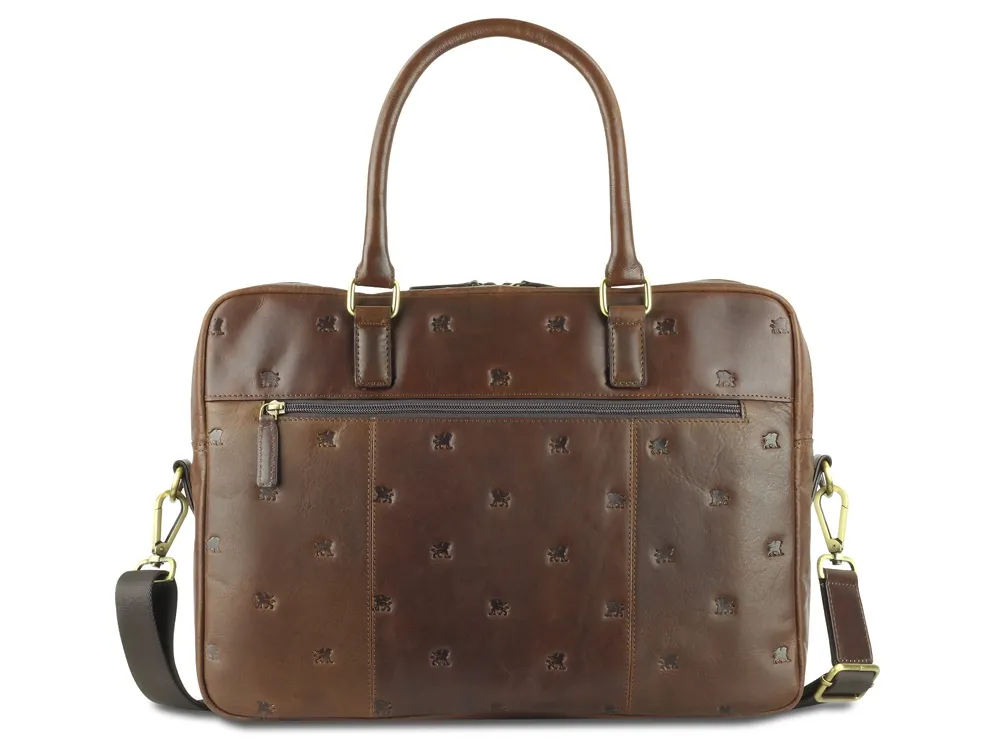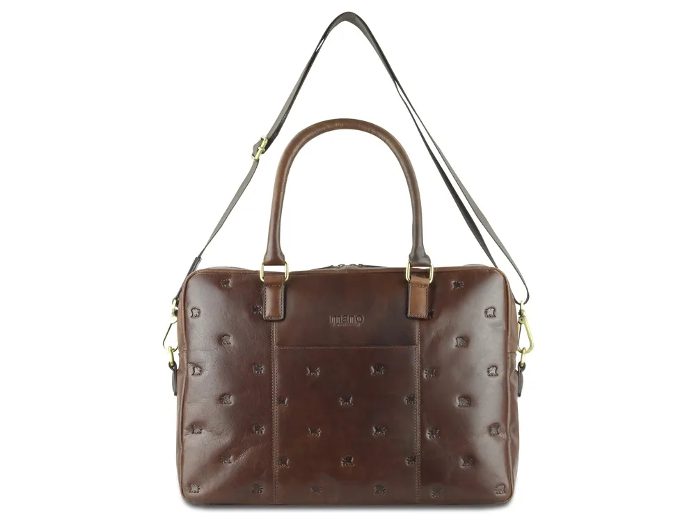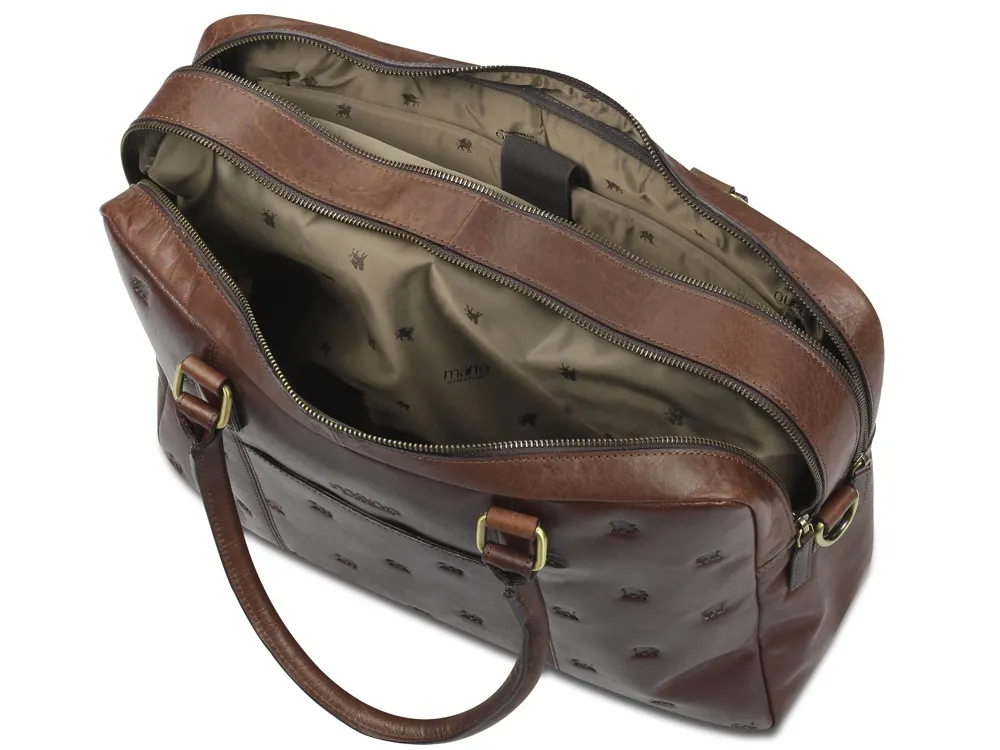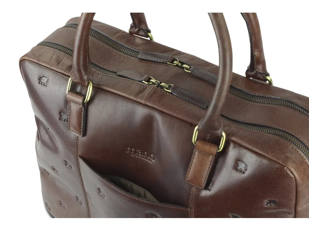 Коллекция «DON LEON» - квинтэссенция инноваций бренда MANO 1919®. Все изделия коллекции изготовлены вручную из высококачественной натуральной кожи буйвола в роскошном коричневом цвете. Элегантное тиснение в виде льва и изящный логотип подчеркивают индивидуальный стиль коллекции. MANO 1919 ®. Бизнес-сумка M191920941 Эстетика и практичность: бизнес-сумка M191920941 отличается элегантным стилем и удобной организацией внутреннего пространства. Вместительные отделения для документов и ноутбука и дополнительные карманы обеспечивают идеальное хранение необходимых вещей. Бизнес-сумка станет незаменимым компаньоном для мужчин, которые ценят удобство и комфорт. Благодаря классической форме и роскошному коричневому цвету бизнес-сумка является привлекательным спутником в повседневной жизни. Размеры: 30 см (В) x 42 см (Ш) x 11,5 см (Г) Материал: натуральная кожа буйвола Особенности: • 2 основных отделения на молнии с внутренним карманом на молнии • Дополнительное отделение • Мягкое отделение для ноутбука диагональю 13″ • Карман для мобильного телефона и 2 отделения для ручек • Задний карман на молнии • Съемный регулируемый плечевой ремень до 145 см • Ремень для крепления к телескопической ручке чемодана • Первоклассная кожа, качественная подкладка и надежные застежки на молнии гарантируют долговечность изделия