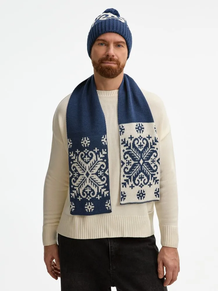Шарф Wintertude выполнен из качественной полушерстяной пряжи в двух гармоничных цветах, которые подчеркивают сложный жаккардовый рисунок. Двухслойная структура обеспечивает дополнительное тепло и объем, сохраняя при этом легкость и мягкость.